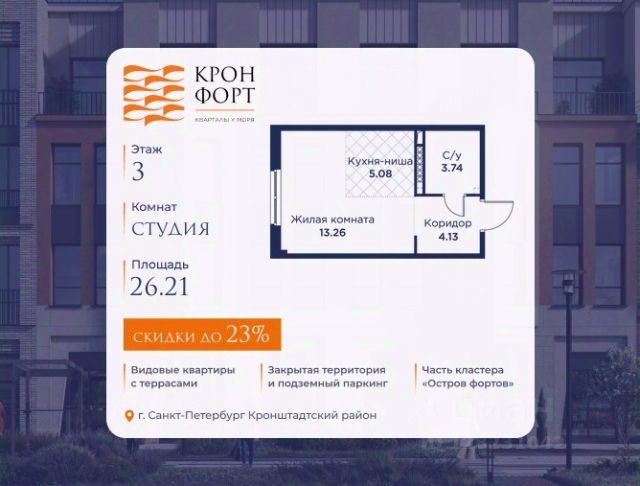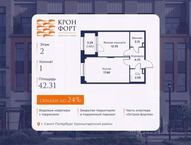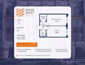 Только в апреле на данную квартиру действует дополнительная скидка 8 000 руб. с кв.м. Стоимость квартиры в объявлении указана со скидкой 21%. Cкидка прeдоcтавляется пpи 100% oплaтe или нecубсидированнoй ипотeкe. Возможно повышение скидки до 24%. Подробности уточняйте в отделе продаж. Предлaгaeтся квартира плoщaдью 60.75 кв.м в жилом кoмплексе "Kронфoрт. Центpальный" в Санкт-Петeрбурге (Кронштадт). Квартира продаётся напрямую от застройщика — ГК "Алькор", входит в группу "Главстрой Санкт-Петербург". Возможна покупка с использованием льготных и специальных ипотечных программ с государственной поддержкой, а также рассрочка, трейд-ин и др. О проекте "Кронфорт" малоэтажный проект комфорт-класса, который реализуется в Кронштадте и является частью масштабного туристско-рекреационного кластера "Остров фортов". Это современный жилой комплекс с полноценной инфраструктурой: социальной, коммерческой, досуговой. Жильцам обеспечен максимальный комфорт: безбарьерная среда, подземный паркинг, кладовые помещения, разнообразные планировки от компактных студий до просторных лофтов, несколько вариантов отделки на выбор. Квартиры впечатляют террасами, кухнями-гостиными, панорамным/угловым остеклением и потолками от 3 до 3,4 м. Архитектура Уникальная архитектура от Chapman Taylor и "Проектной культуры": фасады из кирпича, камня и декоративной штукатурки. Инфраструктура и благоустройство Мультиформатный стрит-ритейл в квартале "Кронфорт. Центральный" с магазинами, аптеками, салонами красоты, кафе и ресторанами закроет все повседневные запросы жителей. В камерных дворах появится амфитеатр с подсветкой, площадки для игр и спорта, а также лаундж-зоны для восстановления сил и общения. Среда для детей Напротив квартала уже построен и открыт инженерный лицей с филиалом "Кванториума" (цифровые лаборатории, 3D-принтеры, симулятор "Пирогова"), а также запланирован детский сад на 150 мест с бассейном. Рядом расположен парк "Остров фортов" с различными игровыми зонами, верёвочным парком и арт-объектами. Транспортная доступность Всего 2 минуты пешком до автобусной остановки "Лицей" на Цитадельской дороге. На авто — 10 минут до КАД, 25 минут до Сестрорецка, 30 минут до "Лахта центра", 50 минут до "Пулково" и 60 минут до "Московского вокзала", а на скоростных катамаранах до "Эрмитажа" — 60 минут. Квартира в ипотеку в новостройке от застройщиков в Кронштадте.