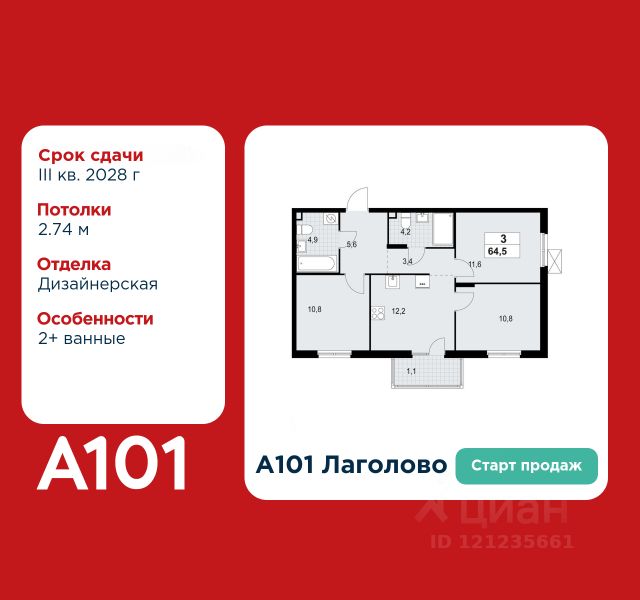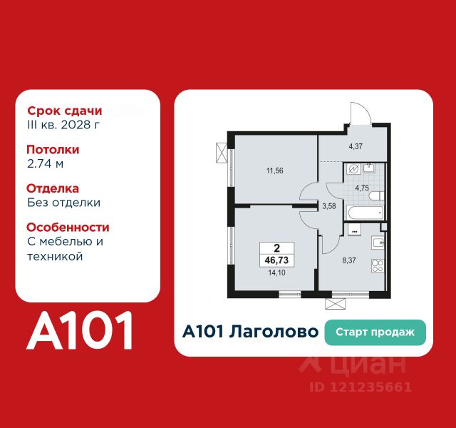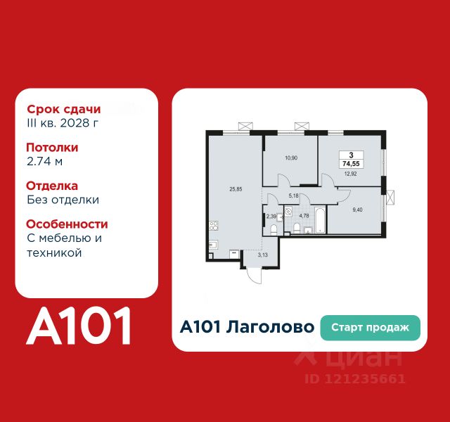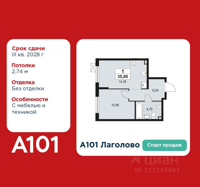 Старт продаж! 1-комнатная квартира площадью 35.80 в ЖК "А101 Лаголово" на 2 этаже. Квартира без отделки. Вид из окна на улицу. В квартире 1 санузел. Высота потолков 2.74 м. Предложения от застройщика на ноябрь 2025: - Гибкая рассрочка 20 000 руб/мес. и первым взносом 10%. ОТДЕЛКА Квартира передается без отделки. Благодаря тому, что в данном типе отделки стены не возводятся, вы сможете создать удобную планировку и самостоятельно организовать зонирование комнат. ОСОБЕННОСТИ ПЛАНИРОВКИ Из окон квартиры открывается живописный вид на зелёный пешеходный бульвар, который строится одновременно с домами. КВАРТИРА С МЕБЕЛЬЮ И ТЕХНИКОЙ В стоимость квартиры включен сертификат на 100 000 рублей от партнеров Hoff и M.Видео. Вы можете увеличить сумму сертификата и добавить его в ипотеку. А также у вас будет возможность увидеть все товары вживую перед установкой и выбрать лучшие варианты для обустройства вашей квартиры. ПАРАДНАЯ. В каждой парадной предусмотрены места для хранения велосипедов и колясок, гостевой санузел и удобная зона ожидания для гостей. ДВОРЫ И ОКРУЖЕНИЕ. Просторные дворы безопасны для детей, так как свободны от машин, закрыты от посторонних и постоянно находятся под видеонаблюдением. Во дворах создается разнообразная среда для детей всех возрастов: детские площадки с батутами, тактильными дорожками и игровыми комплексами. Для активного отдыха - воркаут-площадки, столы для пинг-понга и газоны для занятий йогой. Во дворах есть и тихие уголки - зеленые гостиные с уличной мебелью, где можно поработать на свежем воздухе или отдохнуть в тишине. Из внутренних дворов комплекса можно выйти на пешеходный бульвар длиной около 900 метров. Здесь будет организовано полноценное общественное пространство с амфитеатром, уличным кафе, ручьем, фонтаном и множеством мест для отдыха и игр. Большую часть бульвара займут благоустроенные зеленые зоны и теневые сады из десятков видов деревьев и кустарников, многолетних цветов и трав, которые будут радовать глаз круглый год. "А101 Лаголово" - современный город у подножия знаменитых Дудерговских высот, в объятиях чистейших озер и зеленых живописных массивов, наполненный всем необходимым для счастливой жизни. ИНФРАСТРУКТУРА. Мы занимаемся комплексным освоением территории. Наш приоритет - доступность всех сервисов для счастливой жизни. 1. Лаголово-город 15-ти минутной доступности. Вся необходимая инфраструктура: магазины, салоны красоты, образовательные учреждения, медицинские центры находятся в 15-ти минутах пешей прогулки от любой точки жилого комплекса. Это позволяет не тратить время на долгие перемещения. 2. Представьте идеальный город, где ребенок может спокойно играть, а пожилой человек наслаждаться заслуженным отдыхом. Жилая среда нашего комплекса может комфортно использоваться как 8-летним ребенком, так и 80-летним пожилым человеком. Дома, улицы, общественные пространства, тротуары спроектированы с заботой о людях разных возрастов. 3. Мы активно развиваем авторскую образовательную экосистему "Лёрнити
