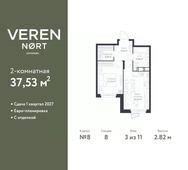 Однокомнатная квартира с предчистовой отделкой в Veren Nort Сертолово на 7 этаже. Общая площадь: 40.84 кв.м., жилая: 11.35 кв.м., площадь просторной куxни-гостиной: 16.06 кв.м. Квартира угловая, идеально подойдет любителям тишины и панорамных видов. В квартире одна лоджия, один совмещенный санузел. Высота потолков 2.82 м.
