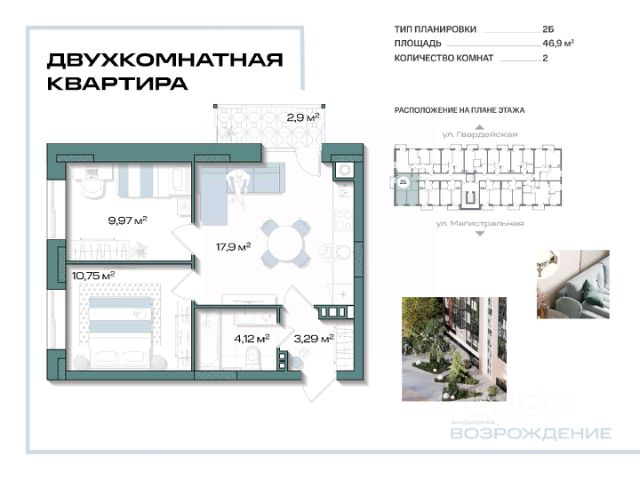 Продаётся 2-комнатная квартира в строящемся доме (Дом 6), срок сдачи: I-кв. 2028, общей площадью 46.9 кв.м., на 8 этаже. Новый клубный дом "Аксиома.Возрождение" от застройщика "Аксиома" расположен по адресу: г. Кировск, ул. Красных Сосен, 6