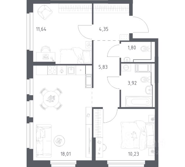 В продаже 2-комнатная квартира в корпусе 35.1 ЖК 'Новое Колпино'. Квартира располагается на 2 этаже, общая площадь 59.24 м2.