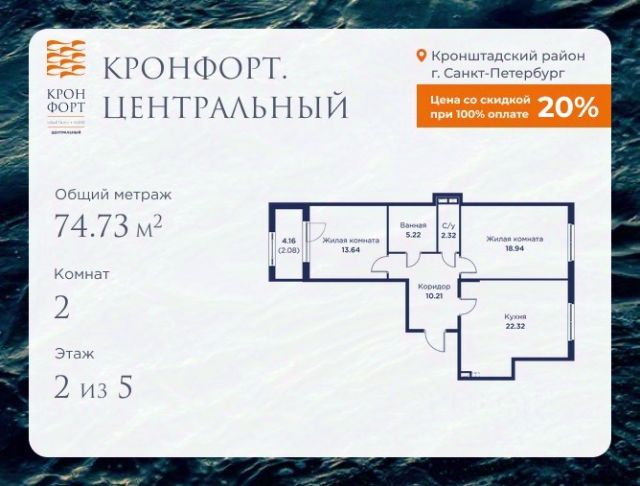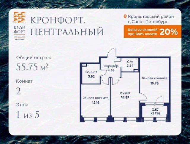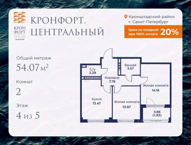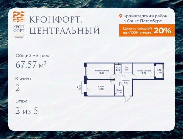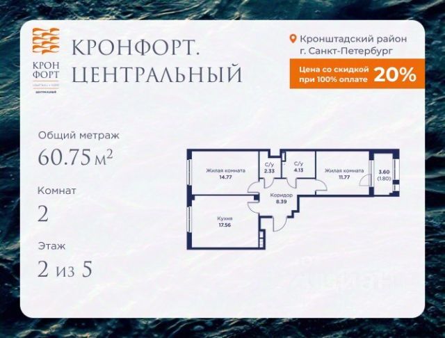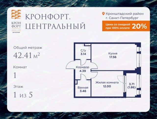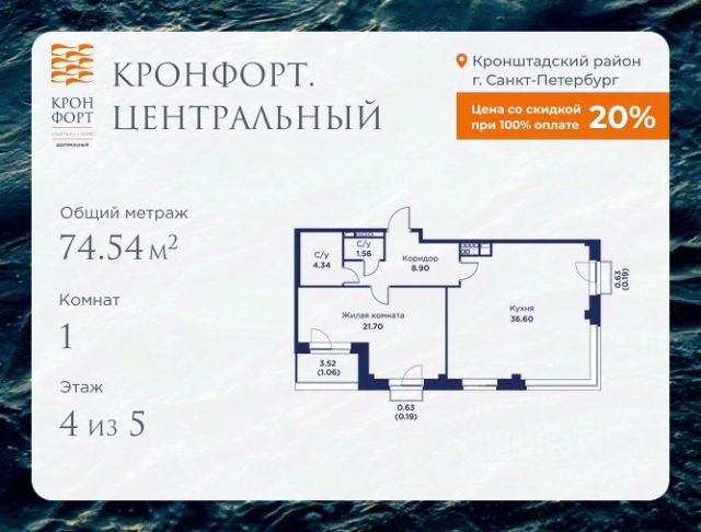 Стоимость квартиры указана со скидкой 20%. Скидка предоставляется при 100% оплате или несубсидированной ипотеке. Предлагается квартира площадью 39.31 кв.м в жилом комплексе "Кронфорт. Центральный" в Санкт-Петербурге (Кронштадт). Возможна покупка с использованием льготных и специальных ипотечных программ с государственной поддержкой. Высота потолков в квартирах — от 3 до 3,4 метров, окна увеличенного размера, есть варианты с эркерами, французскими балконами, лоджиями и террасами. Жилой квартал состоит из пяти четырехэтажных корпусов с закрытыми охраняемыми дворами, свободными от машин. Первые этажи формируют торговые променады в стиле пешеходных улиц исторической части Петербурга и Кронштадта. Внутренние пространства между корпусами — пешеходные зоны с уютными площадями. Архитектурный облик квартала разработан бюро "Проектная культура" и международной компанией Chapman Taylor. Инфраструктура комплекса включает: - Лицей с двумя бассейнами - Детский сад на 150 мест с бассейном и закрытой территорией - Веревочный парк - Игровые площадки для активного отдыха; - Кабинет врача общей практики. - Подземные паркинги с лифтами. - Мусоросборные камеры, индивидуальные кладовые. - Закрытые дворы с контролем доступа и видеонаблюдением. - Мультформатный стрит-ретейл с кафе и ресторанами. - Триатлон-центр и беговые/велодорожки. - Учебно-тренировочный комплекс для детей "Лагерь настоящих героев". Транспортная доступность обеспечивает удобный выезд на КАД (около 1-3 км), 2 минуты пешком до автобусной остановки "Лицей", 25 минут до Сестрорецка, 30 минут до "Лахта-центра", 50 минут до аэропорта "Пулково" и 60 минут до Московского вокзала. Для любителей моря доступен маршрут на "Метеоре" до центра Санкт-Петербурга. Отделка квартир предлагается как с готовой чистовой отделкой, так и со свободной планировкой без отделки для реализации индивидуальных дизайнерских решений. В третьем корпусе, продажи которого стартовали в марте 2025 года, доступны квартиры с просторными террасами, тремя балконами, кухнями-гостиными до 38 кв.м с окнами на две стороны, обеспечивающими панорамное освещение и виды. Если вам нужна помощь с оформлением ипотеки или дополнительная информация по комплексу и условиям покупки, обращайтесь в отдел продаж за консультацией. Продам квартиру в новостройке с отделкой в районе Кронштадтский в Санкт-Петербурге.