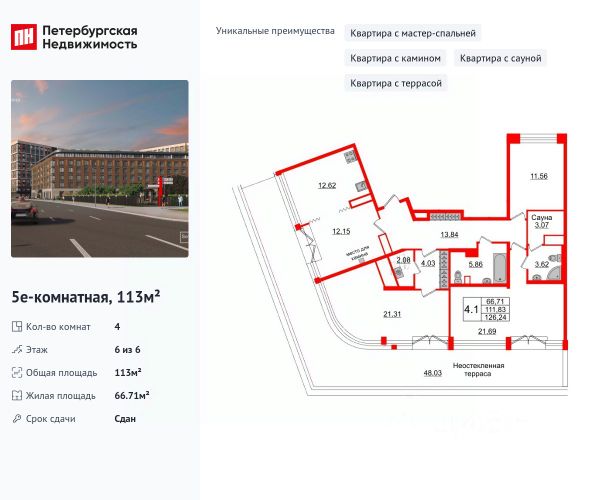 Продается уютная, семейная 4-комнатная квартира от застройщика в жилом комплексе "Amber Club" в уютном Василеостровском районе. До метро можно добраться пешком всего за 15 минут. Уникальная особенность этой квартиры возможность установить настоящий дровяной камин, который создаст атмосферу загородного дома. Мастер-спальня с собственной ванной комнатой. Самое приватное пространство в вашей квартире. Сауна в ванной комнате. Расслабьтесь и восстановите силы, как в СПА-салоне. Открытая терраса! Завтракайте или занимайтесь спортом на свежем воздухе! Уникальная, функциональная европланировка, большая кухня-гостиная 12.62 м², просторная прихожая 17.87 м². Общая площадь квартиры - 113 м², жилая 66.71 м², высота потолка 3.06 м. Квартира продается с отделкой "Норд Лайн серый комфорт". Что особенного в ЖК "Amber Club"? • Уникальные квартиры пентхаусы, квартиры с террасами и каминами • Премиальные виды на Малую Неву и Петровский остров • Шаговая доступность до метро (15 мин. Пешком), удобный выезд на ЗСД прямо с набережной • Amber-сквер с relax-зонами в экостиле и прогулочной аллеей • Единые входные группы со вторым светом, reception и лаунж-зонами квартира в новостройке с отделкой в округе Остров Декабристов в Санкт-Петербурге.