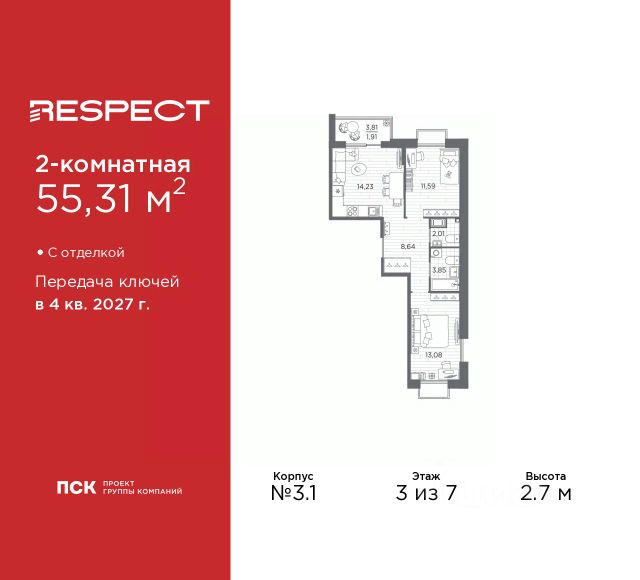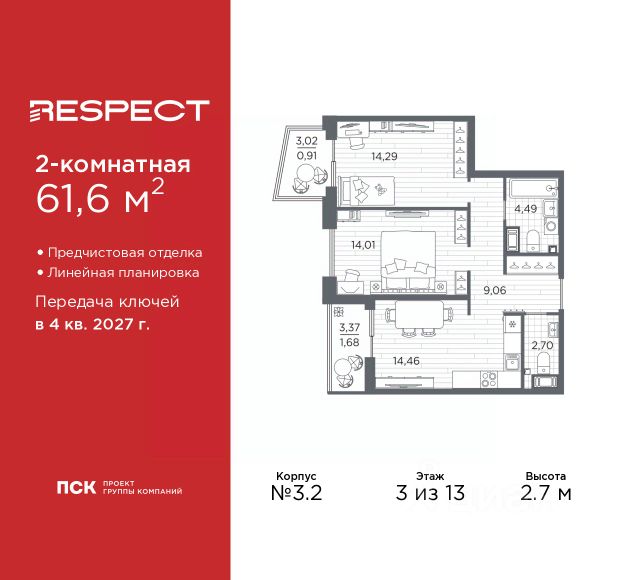 2-комн. квартира с предчистовой отделкой в ЖК "RESPECT" на 7 этаже. Общая площадь: 57.48 кв.м., жилая: 25.78 кв.м., площадь просторной кухни-столовой: 15.7 кв.м. Квартира без проходных комнат, окна выходят нa три cтopoны дома. В квартире один балкон, один совмещенный и один раздельный санузел. Высота потолков 2.7 м. Квартира находится в корпусе 2. Дом монолитный, одноподъездный, высотой 7 этажей. На этаже 4 квартиры. В подъезде 1 пассажирский и 1 грузовой лифт. Окончание строительства - 1 квартал 2026 года. Оформление сделки по договору долевого участия. В шаговой доступности от жилого комплекса имеются станции метро (расстояние по прямой): "Лесная" (800 м), "Площадь Мужества" (1.4 км), "Выборгская" (1.9 км), также недалеко от этого корпуса расположены станции метро: "Академическая", "Политехническая". Квартал строится на Полюстровском пр, 87, в одной из самых востребованных локаций Петербурга. В 10 минутах пешком - метро "Лесная" и в 10 минутах на транспорте - Петроградская сторона. Высота домов от 7 до 13 этажей. На территории Respect строится школа на 1125 учащихся и детский сад на 240 мест. Запроектированы собственная газовая котельная, закрытая территория, дворы без машин и подземные паркинги с лифтами. Вентилируемые фасады облицованы клинкерным кирпичом. Дома из этого материала служат веками, являясь гордостью хозяев. Дизайн парадных зон и входных групп - сочетание лаконичности отделки и декоративных элементов с текстурами из натурального камня и дерева с приглушенной подсветкой теплым светом. Во входных группах расположены гостевые зоны с мягкой мебелью. Вся территория квартала будет связана единой концепцией благоустройства, разработанной ландшафтным бюро L.BURO. В основе - идея создания увлекательного ландшафтного пространства для насыщенной жизни, включающего в себя пейзажные зоны, современные архитектурные композиции, открытые террасы на стилобатах с зонами отдыха и парклетами, спортивными площадками. Это пространство для людей всех возрастов и различных увлечений. На эксплуатируемой кровле на уровне первого этажа в домах 1 и 4 будут обустроены общественные видовые террасы. В квартале запроектированы внутренние закрытые территории дворов домов без доступа автомобилей и безбарьерная среда для велосипедистов и колясок. Предусмотрены IP-домофония с функцией дистанционного открывания калиток и парадных, а также дистанционный сбор показаний счетчиков и мобильное приложение для жителей. Для безопасности жителей квартала - круглосуточное видеонаблюдение и служба охраны. В каждой квартире предусмотрены внешние корзины для кондиционеров. #26BS3m квартира в новостройке с отделкой в округе Пискарёвка в Санкт-Петербурге.