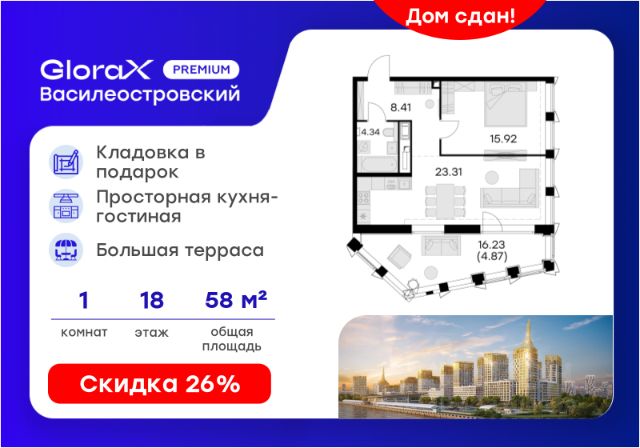 Дом монолитный, многоподъездный, переменной этажности, от 16 до 30 этажей. Квартира находится во 2-й секции высотой 23 этажа в корпусе 2-1. На этаже 11 квартир. В подъезде 1 пассажирский и 2 грузовых лифта. Окончание строительства - 4 квартал 2028 года. Оформление сделки по договору долевого участия.
