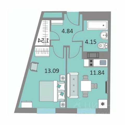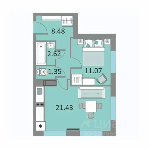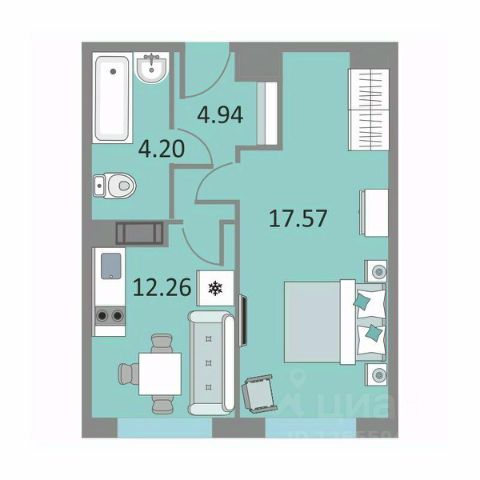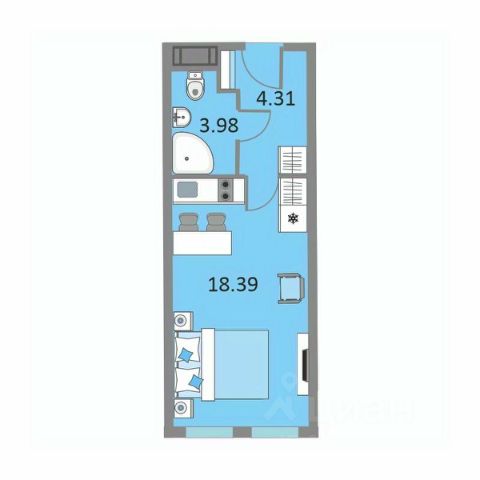 - Удачная двусторонняя планировка, в которой выделена зона кухни-гостиной и спальни (при желании, вы сможете преобразовать апартамент в полноценную однокомнатную квартиру).