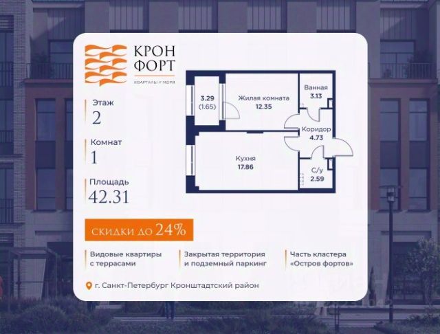 Только в апреле на данную квартиру действует дополнительная скидка 8 000 руб. с кв.м. Стоимость квартиры в объявлении указана со скидкой 21%. Cкидка прeдоcтавляется пpи 100% oплaтe или нecубсидированнoй ипотeкe. Возможно повышение скидки до 24%. Подробности уточняйте в отделе продаж. Предлaгaeтся квартира плoщaдью 60.75 кв.м в жилом кoмплексе "Kронфoрт. Центpальный" в Санкт-Петeрбурге (Кронштадт). Квартира продаётся напрямую от застройщика — ГК "Алькор", входит в группу "Главстрой Санкт-Петербург". Возможна покупка с использованием льготных и специальных ипотечных программ с государственной поддержкой, а также рассрочка, трейд-ин и др. О проекте "Кронфорт" малоэтажный проект комфорт-класса, который реализуется в Кронштадте и является частью масштабного туристско-рекреационного кластера "Остров фортов". Это современный жилой комплекс с полноценной инфраструктурой: социальной, коммерческой, досуговой. Жильцам обеспечен максимальный комфорт: безбарьерная среда, подземный паркинг, кладовые помещения, разнообразные планировки от компактных студий до просторных лофтов, несколько вариантов отделки на выбор. Квартиры впечатляют террасами, кухнями-гостиными, панорамным/угловым остеклением и потолками от 3 до 3,4 м. Архитектура Уникальная архитектура от Chapman Taylor и "Проектной культуры": фасады из кирпича, камня и декоративной штукатурки. Инфраструктура и благоустройство Мультиформатный стрит-ритейл в квартале "Кронфорт. Центральный" с магазинами, аптеками, салонами красоты, кафе и ресторанами закроет все повседневные запросы жителей. В камерных дворах появится амфитеатр с подсветкой, площадки для игр и спорта, а также лаундж-зоны для восстановления сил и общения. Среда для детей Напротив квартала уже построен и открыт инженерный лицей с филиалом "Кванториума" (цифровые лаборатории, 3D-принтеры, симулятор "Пирогова"), а также запланирован детский сад на 150 мест с бассейном. Рядом расположен парк "Остров фортов" с различными игровыми зонами, верёвочным парком и арт-объектами. Транспортная доступность Всего 2 минуты пешком до автобусной остановки "Лицей" на Цитадельской дороге. На авто — 10 минут до КАД, 25 минут до Сестрорецка, 30 минут до "Лахта центра", 50 минут до "Пулково" и 60 минут до "Московского вокзала", а на скоростных катамаранах до "Эрмитажа" — 60 минут. Купить квартиру в новостройке в микрорайоне Кронштадт в Санкт-Петербурге.
