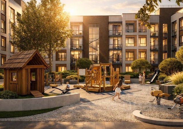 Территория квартала безбарьерная. В каждом дворе будет выполнено уникальное благоустройство по авторскому проекту с детскими и спортивными площадками, местами для отдыха и активностей. Концепция озеленения выстроена по принципу "живописный двор круглый год". Любителям активного образа жизни особенно понравятся эксплуатируемые кровли с зонами для йоги и солярия, откуда открывается невероятный вид на зеленый лес, раскинувшийся вокруг квартала.