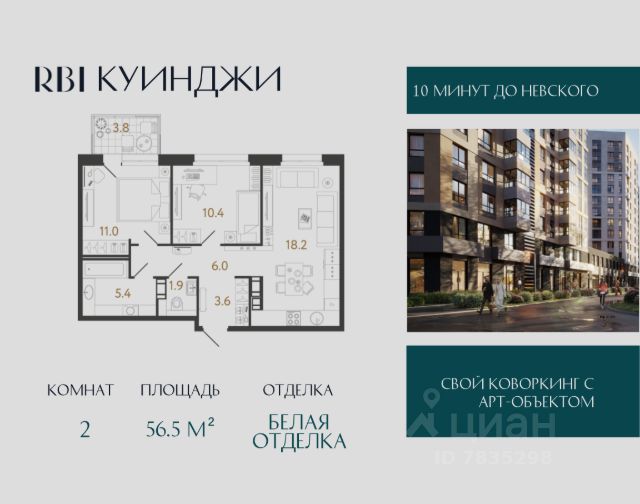 Студия в ЖК Куинджи от RBI с подчистовой отделкой. Окна на запад (закатная сторона), во двор.