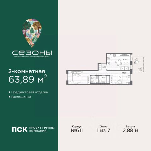 Продается 2-комн. квартира от застройщика с предчистовой отделкой в ЖК "Сезоны" на 2 этаже. Общая площадь: 54.34 кв.м., жилая: 23.54 кв.м., площадь просторной кухни-столовой: 17.09 кв.м. Квартира угловая, идеально подойдет любителям тишины и панорамных видов. В квартире один балкон, два совмещенных санузла. Высота потолков 2.88 м. Дом монолитный, многоподъездный, высотой 7 этажей. Квартира находится в 1-й секции в корпусе 611. На этаже 4 квартиры. В подъезде 1 грузовой лифт. Начало строительства - 4 квартал 2025 года. Окончание строительства - 2 квартал 2028 года. Оформление сделки по договору долевого участия. Видовой жилой комплекс "Сезоны" от ГК ПСК возводится в одном из самых востребованных и престижных районов Санкт-Петербурга - Приморском, рядом с Суздальским и Выборгским шоссе. Такое расположение обеспечивает удобный выезд в разные части города, сочетая городской комфорт с близостью к природе. Всего в 50 метрах находится природный заказник "Новоорловский" и речка Каменка, а в пешей доступности - Суздальские озёра. Приморский район отличается развитой социальной и транспортной инфраструктурой. Здесь расположены крупные торговые и деловые центры, современные спортивные объекты, медицинские учреждения, магазины, кафе и рестораны. Комплекс включает четыре корпуса, ввод которых в эксплуатацию запланирован на 2028 год. Проект и прилегающий микрорайон разработаны в соответствии с концепцией "15-минутного города", при которой вся необходимая инфраструктура находится в шаговой доступности. В ближайшем окружении - две школы, пять детских садов, магазины, кафе, салоны красоты, банковские отделения и пункты выдачи заказов. Также предусмотрены два четырёхъярусных паркинга с лифтами на 288 машиномест. О застройщике ГК ПСК - один из крупнейших девелоперов Санкт-Петербурга с более чем 18-летней историей. Компания реализует проекты во всех сегментах недвижимости - от премиальных жилых комплексов до масштабных кварталов комфорт-класса и апарт-отелей. По данным портала ЕРЗ.РФ, ПСК входит в ТОП-3 крупнейших застройщиков Санкт-Петербурга по объёму текущего строительства. Портфель компании превышает 3 млн кв. м жилой и коммерческой недвижимости. Все объекты сдаются строго в срок и отличаются высоким уровнем архитектурных и инженерных решений. #2tOOua