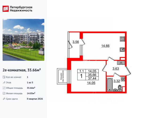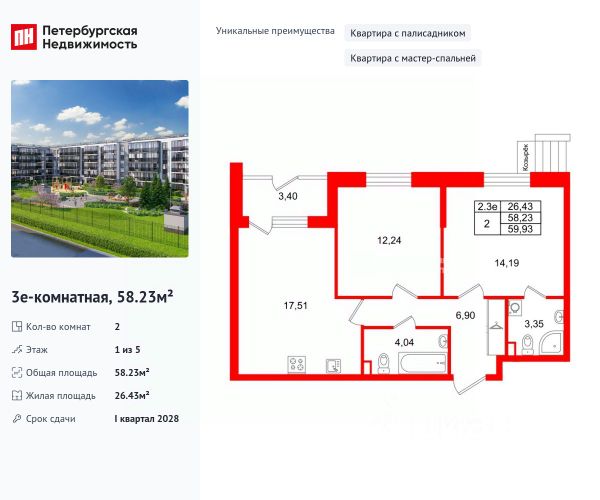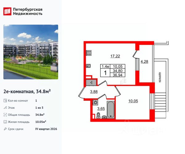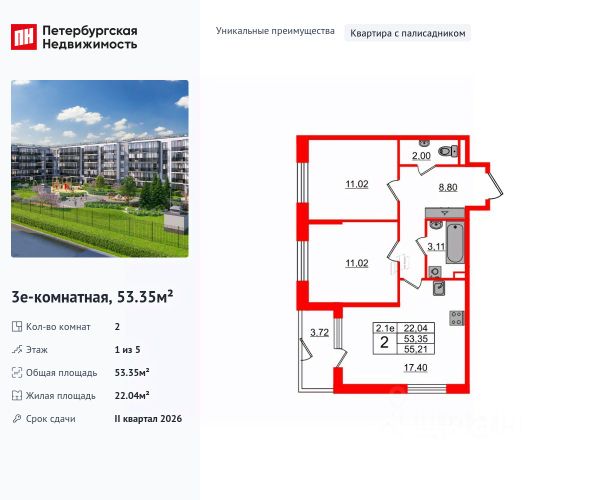 Продается уютная 2-комнатная квартира от застройщика в жилом комплексе "Парадный ансамбль" в престижном Московском районе. До метро можно добраться на транспорте всего за 20 минут. Удобная, классическая, функциональная европланировка, большая кухня-гостиная 17.4 м², просторная прихожая 8.8 м². Общая площадь квартиры - 52.88 м², жилая 22.04 м², высота потолка 2.77 м. Квартира продается с отделкой "Норд Лайн серый". Что особенного в ЖК "Парадный ансамбль"? • Уникальные квартиры. Хай Флет (High Flat) на последних этажах, палисадники у квартир на первом этаже, семейные секции, квартиры с саунами и окном в ванной • Масштабное малоэтажное строительство в престижном Московском районе • Рекреационные зоны: парадный парк в центре квартала, ручей с собственной набережной, центральная площадь, ресторанный комплекс и пешеходный бульвар • Фасады из керамогранита и кирпича с яркими и акцентными входными группами • Две самые большие площадки Setl Kids и Setl Sport • Инновационный Лицей Setl с оригинальной архитектурной концепцией и уникальной образовательной средой Продается квартира в новостройке в округе Пулковский меридиан в Санкт-Петербурге.