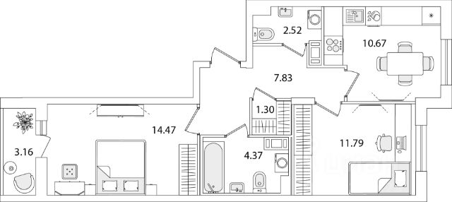 • Лоджия: 2,74 кв.м.