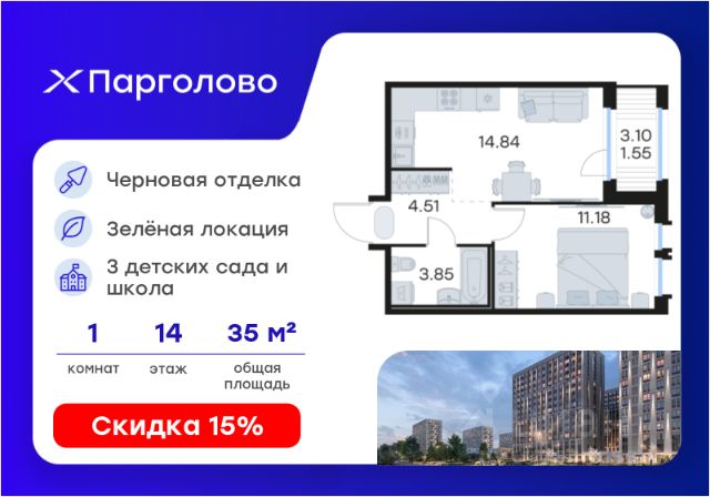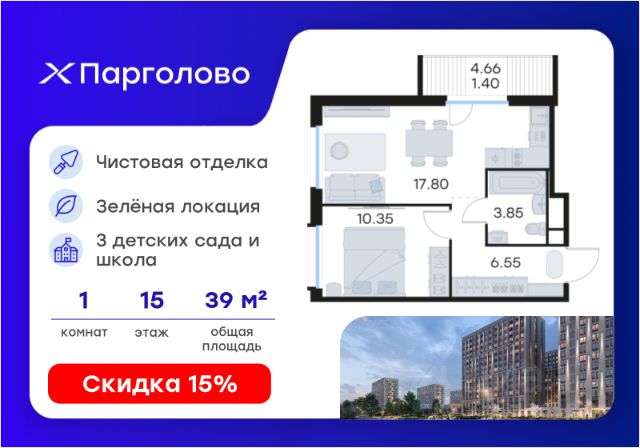 Продается 1-комн. квартира на 2-м этаже в проекте комфорт-класса Парголово. Общая площадь лота составляет 39,99 кв. м, из которых 10,42 кв. м отведено под жилую и 17,89 кв. м под кухонную зону. Номер квартиры - 15. Преимущества: - Квартира комфорт-класса - Зеленый район, Шуваловский парк в 20 мин. пешком - 10 мин. до КАД, 15 мин. до ЗСД - 5 эт. паркинг на 451 м/м - Закрытые дворы с видеонаблюдением - Детские площадки с геопласткой и бизиборадми - Сады и школы в шаговой доступности - Спортивные площадки и велодорожки - Собственный комьюнити-центр - Келлеры для хранения - Коммерческие помещения на 1 этажах Парголово — масштабный проект комфорт-класса в Выборгском районе Санкт-Петербурга девелопера GloraX. Место, продуманное до мелочей, где все, что необходимо — рядом. Архитектурно-пространственное решение отличается лаконичностью и строгостью и придает проекту свой характер. Внутренние дворы закрыты от внешнего мира, создавая приватную территорию для жителей. Живите на природе, но с комфортом мегаполиса. Десять минут на велосипеде или полчаса пешком — и вы окажетесь в одном из культовых мест отдыха петербуржцев: Шуваловском парке, Орловском заказнике с их чистыми карьерами или на Суздальских озерах. До ж/д станции "Парголово" 7 минут на автомобиле, до метро Проспект Просвещения 25 минут, КАД 10 минут, ЗСД 15 минут. В шаговой доступности остановка общественного транспорта. В шаговой доступности — собственные школы и детские сады. Здесь все создано для максимального комфорта каждого жителя. Приватное пространство внутреннего двора с беседками с розетками для работы и отдыха, зеленый двор с уютным многоуровневым освещением, детскими эко-площадками и спортивными площадками создает неповторимую атмосферу, заряжающую энергией на новые свершения. Квартиры сдаются без отделки. Узнайте подробности в Отделе продаж. Купить квартиру в новостройке в микрорайоне Парголово в Санкт-Петербурге.