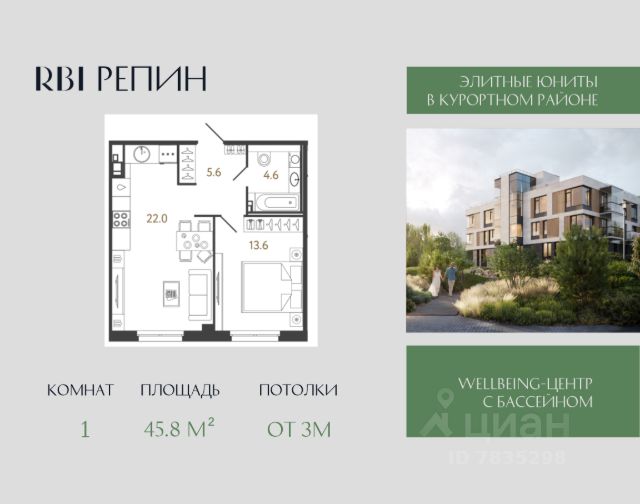 "Репин" — элитный лаунж-комплекс от RBI в Курортном районе Петербурга в посёлке Репино по адресу Приморское шоссе, 441. Шоссе считается петербургским аналогом трассы Канны Ницца Монако. Вместо пиний — сосновый лес, который сменяется открытыми морскими видами хотя и не Средиземного моря, но такого же просторного Финского залива. Проезжая по Приморскому шоссе, вы уже отдыхаете. После Репинских Пенатов дорога круто поворачивает к югу и совершает плавную дугу к западу — именно здесь в 400 метрах от залива располагаются роскошные виллы вэлнес-комплекса "Репин". Формат проживания камерный — без суеты и лишнего шума. В четырёх виллах всего 84 сити-хауса. Есть номера с палисадниками и отдельным входом, лоты с террасами и возможностью установки дровяного камина, двухэтажные юниты с двусветной кухней-гостиной, высота потолков в которой достигает 6,3 или 6,6 метров. На типовых этажах потолки 3 метра, на последнем этаже — 3,3 метра. Площадь юнитов от 45,8 до 150,7 м² — можно приобрести инвестиционный лот под сдачу в аренду или купить номер для собственного роскошного проживания. Конструкция стен продумана таким образом, чтобы вы могли реализовать перепланировку пространства вплоть до объединения соседних юнитов с сохранением высокой звукоизоляции между номерами. На территории комплекса находятся ещё два инфраструктурных корпуса — они располагаются вдоль шоссе и создают визуальный и акустический барьер для вилл. В первом корпусе находятся центральная входная группа с ресепшн и зоной ожидания гостей, ресторан с отдельным входом и wellbeing-центр, где оборудуют спортзал, бассейн, хамам и сауну. Всё, чтобы вы могли переключиться от рутины и обрести себя заново! Во втором корпусе — трёхуровневый паркинг на 60 машиномест. Ещё 10 м/м на уличной автостоянке. Все виллы — малоэтажные и размещены в шахматном порядке, чтобы вы могли наблюдать умиротворяющий пейзаж прямо из окон или с террасы своего номера. Лаконичная скандинавская архитектура вторит окружению и способствует расслаблению, а декоративная ландшафтная подсветка преображает комплекс в сумерки. Приватная охраняемая территория утопает в зелени: равнины перемежаются с живописными холмами, создавая аллюзию на пейзажный парк. Среди всей этой красоты благоустроены разнообразные лаунжи: две открытые площадки для встреч у костра и обогреваемая фуршетная зона, подиум с деревянными шезлонгами и декоративный водоём с кинетической скульптурой от Владислава Муханова и Ивана Зубарева. Дети могут играть на экологичной детской площадке во дворе, а спортсмены — заниматься на профессиональных уличных тренажёрах FOREMAN. Refresh-коплекс "Репин". Ваш источник безмятежности в лоне природы побережья Финского залива! Купить квартиру в новостройке в поселке Репино в Санкт-Петербурге.
