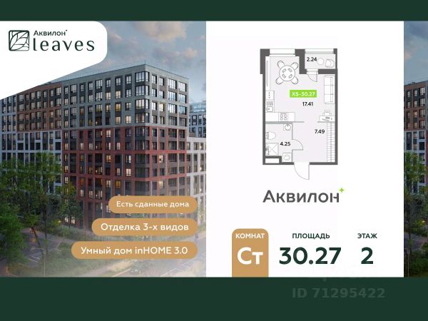 Купи квартиру в ЖК "Аквилон Leaves"! Отделка В квартире выполнена предчистовая отделка WhiteBox +Возможен дозаказ отделки в любом из 3 цветов: SAND, TERRA, GRAPHITE Отделка входит в стоимость квартиры в ДДУ ЖК "Аквилон Leaves" Жилой комплекс класса бизнес-лайт "Аквилон Leaves" воплощает идеальную синергию природы, технологий и дизайна. В одном из самых престижных районов Санкт-Петербурга мы создаем функциональную жилую среду, которая позволит максимально быстро и удобно решать бытовые вопросы, сохраняя ценное время для семьи и любимых занятий. -Малошумные лифты -Сквозные парадные -Светопрозрачные входные группы -Увеличенная высота первого этажа -Безбарьерная среда -Подземный паркинг Стандарты Группы Аквилон для вашей комфортной жизни Thermo-S экономия на коммунальных платежах за счет дополнительно утепленных стен, кровли и цоколя. Энергоэффективные окна с селективным покрытием и аргоновым заполнением Soundstop - дополнительная шумоизоляция внутренних перегородок и межэтажных перекрытий, шумозащитные окна, малошумные лифты Light-in - в квартирах устанавливаются широкоформатные окна, увеличены на 30%. Высота подоконников на уровне 60 см от пола. Vent-in - в каждой комнате есть клапаны индивидуальной вентиляции, которые обеспечивают приток свежего воздуха с улицы. inHOME умный дом в каждой квартире Интеллектуальная цифровая система, которая позволит дистанционно решать бытовые вопросы, управлять квартирой и экономить на оплате коммунальных услуг. В состав inHOME входят: IP-домофон, Face key, "умные" счетчики, датчики протечки, дистанционное отключение розеток, и т.д. Двор ваш личный парк Благоустройство двора от студии ландшафтного дизайна MEGABUDKA отсылает нас к образу зеленого листа. Современная архитектура гармонирует с окружающей средой, а экологические стандарты и "умные" системы обеспечивают ежедневный комфорт. -Зонирование на площадки для активного и спокойного отдыха. -Ландшафт с геопластикой и рельефом напоминает естественную красоту природных парков. -Всесезонные растения -Высаживаются взрослые деревья и кустарники Локация и инфраструктура Помимо разнообразной инфраструктуры, рядом с комплексом расположен Пулковский парк и сад "Дубовая роща". У жителей будут все возможности для отдыха на свежем воздухе. Велопрогулка, пробежка или летний пикник наслаждайтесь природой, не уезжая далеко загород. -10 мин. до м. Московская -15 мин. до м. Звездная -15 мин. до аэропорта Пулково -30 мин. до Невского пр. #ZmEgC9 Квартира в новостройке на улице Среднерогатская в Санкт-Петербурге.