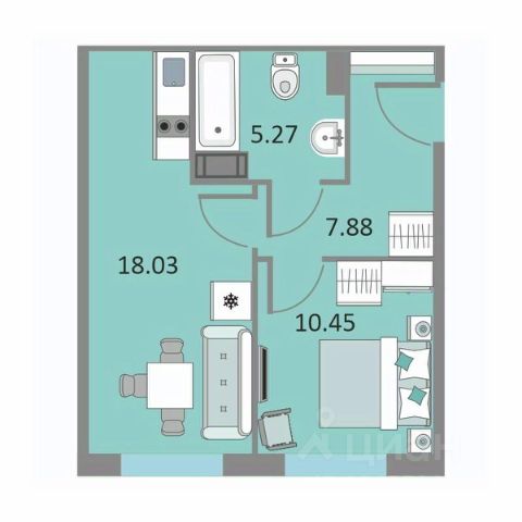 Вторая комната примыкает к кухне. В ней можно поставить детскую кроватку, комод, игрушки или письменный стол с небольшой библиотекой. Также эту комнату можно объединить с кухней.