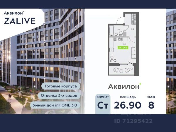 Купи квартиру в ЖК "Аквилон ZALIVE"! Отделка В квартире выполнена предчистовая отделка WhiteBox +Возможен дозаказ отделки в любом из 3 цветов: SAND, TERRA, GRAPHITE Отделка входит в стоимость квартиры в ДДУ ЖК "Аквилон ZALIVE" Жилой комплекс "Аквилон ZALIVE" расположился в уникальной части престижного Васильевского острова. С одной стороны рядом деловой и исторический центр, с другой берег Финского залива и новая современная инфраструктура в пешей доступности. Проект включает в себя пять тринадцатиэтажных "умных" домов в едином архитектурном стиле. Насыщенная социальная инфраструктура, инновации в каждой квартире, стильное благоустройство территории и видовые характеристики это лишь часть уникальных преимуществ жилого комплекса "Аквилон ZALIVE". -Малошумные лифты -Сквозные парадные -Светопрозрачные входные группы -Школа во дворе -Безбарьерная среда -Паркинг Стандарты Группы Аквилон для вашей комфортной жизни Thermo-S экономия на коммунальных платежах за счет дополнительно утепленных стен, кровли и цоколя. Энергоэффективные окна с селективным покрытием и аргоновым заполнением Soundstop - дополнительная шумоизоляция внутренних перегородок и межэтажных перекрытий, шумозащитные окна, малошумные лифты Light-in - в квартирах устанавливаются широкоформатные окна, увеличены на 30%. Высота подоконников на уровне 60 см от пола. Vent-in - в каждой комнате есть клапаны индивидуальной вентиляции, которые обеспечивают приток свежего воздуха с улицы. inHOME умный дом в каждой квартире Интеллектуальная цифровая система, которая позволит дистанционно решать бытовые вопросы, управлять квартирой и экономить на оплате коммунальных услуг. В состав inHOME входят: IP-домофон, Face key, "умные" счетчики, датчики протечки, дистанционное отключение розеток, и т.д. Двор ваш личный парк Для разработки проекта благоустройства и озеленения Группа Аквилон привлекла студию DEREVO PARK, которую ассоциация ландшафтных архитекторов России четыре года подряд признавала лучшей. Два хвойных сада, расположенные вдоль западной стороны квартала, станут визитной карточкой ЖК "Аквилон ZALIVE". Локация и инфраструктура Васильевский остров это море и прогулки, Санкт-Петербургский Государственный Университет и Ростральные колонны, музей современного искусства "Эрарта" и концептуальное пространство "Севкабель Порт". Достаточно переехать через мост и вот вы уже в центре или на Петроградской стороне. - 7 мин. до развязки ЗСД -12 мин. до м. Приморская -15 мин. до м. Невский проспект #Z5acVS Квартира от застройщика на бульваре Головнина в Санкт-Петербурге.