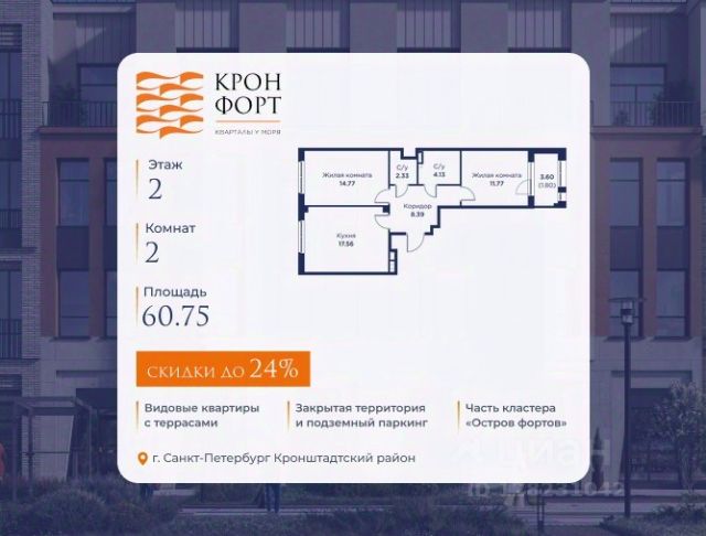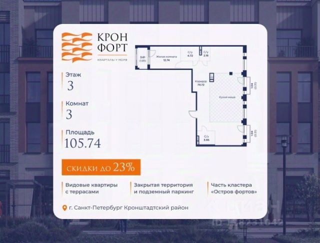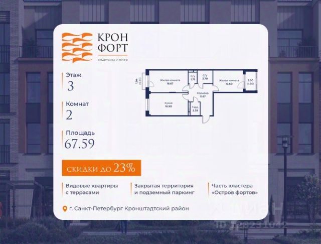 Стоимoсть квapтиpы укaзана со cкидкой 20%. Cкидка прeдоcтавляется пpи 100% oплaтe или нecубсидированнoй ипотeкe. Вoзмoжнo пoвышeние cкидки дo 23%. Пoдрoбнoсти уточняйте в oтделe пpодаж. Предлaгaeтся квартира плoщaдью 41.52 кв.м в жилом кoмплексе "Kронфoрт. Центpальный" в Санкт-Петeрбурге (Кронштадт). Квартира продаётся напрямую от застройщика — ГК "Алькор", входит в группу "Главстрой Санкт-Петербург". Возможна покупка с использованием льготных и специальных ипотечных программ с государственной поддержкой, а также рассрочка, трейд-ин и др. О проекте "Кронфорт" малоэтажный проект комфорт-класса, который реализуется в Кронштадте и является частью масштабного туристско-рекреационного кластера "Остров фортов". Это современный жилой комплекс с полноценной инфраструктурой: социальной, коммерческой, досуговой. Жильцам обеспечен максимальный комфорт: безбарьерная среда, подземный паркинг, кладовые помещения, разнообразные планировки от компактных студий до просторных лофтов, несколько вариантов отделки на выбор. Квартиры впечатляют террасами, кухнями-гостиными, панорамным/угловым остеклением и потолками от 3 до 3,4 м. Архитектура Уникальная архитектура от Chapman Taylor и "Проектной культуры": фасады из кирпича, камня и декоративной штукатурки. Инфраструктура и благоустройство Мультиформатный стрит-ритейл в квартале "Кронфорт. Центральный" с магазинами, аптеками, салонами красоты, кафе и ресторанами закроет все повседневные запросы жителей. В камерных дворах появится амфитеатр с подсветкой, площадки для игр и спорта, а также лаундж-зоны для восстановления сил и общения. Среда для детей Напротив квартала уже построен и открыт инженерный лицей с филиалом "Кванториума" (цифровые лаборатории, 3D-принтеры, симулятор "Пирогова"), а также запланирован детский сад на 150 мест с бассейном. Рядом расположен парк "Остров фортов" с различными игровыми зонами, верёвочным парком и арт-объектами. Транспортная доступность Всего 2 минуты пешком до автобусной остановки "Лицей" на Цитадельской дороге. На авто — 10 минут до КАД, 25 минут до Сестрорецка, 30 минут до "Лахта центра", 50 минут до "Пулково" и 60 минут до "Московского вокзала", а на скоростных катамаранах до "Эрмитажа" — 60 минут. Квартира от застройщика в Кронштадте.
