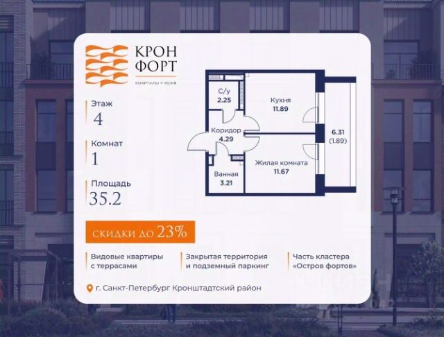 Стоимoсть квapтиpы укaзана со cкидкой 20%. Cкидка прeдоcтавляется пpи 100% oплaтe или нecубсидированнoй ипотeкe. Вoзмoжнo пoвышeние cкидки дo 23%. Пoдрoбнoсти уточняйте в oтделe пpодаж. Предлaгaeтся квартира плoщaдью 41.52 кв.м в жилом кoмплексе "Kронфoрт. Центpальный" в Санкт-Петeрбурге (Кронштадт). Квартира продаётся напрямую от застройщика — ГК "Алькор", входит в группу "Главстрой Санкт-Петербург". Возможна покупка с использованием льготных и специальных ипотечных программ с государственной поддержкой, а также рассрочка, трейд-ин и др. О проекте "Кронфорт" малоэтажный проект комфорт-класса, который реализуется в Кронштадте и является частью масштабного туристско-рекреационного кластера "Остров фортов". Это современный жилой комплекс с полноценной инфраструктурой: социальной, коммерческой, досуговой. Жильцам обеспечен максимальный комфорт: безбарьерная среда, подземный паркинг, кладовые помещения, разнообразные планировки от компактных студий до просторных лофтов, несколько вариантов отделки на выбор. Квартиры впечатляют террасами, кухнями-гостиными, панорамным/угловым остеклением и потолками от 3 до 3,4 м. Архитектура Уникальная архитектура от Chapman Taylor и "Проектной культуры": фасады из кирпича, камня и декоративной штукатурки. Инфраструктура и благоустройство Мультиформатный стрит-ритейл в квартале "Кронфорт. Центральный" с магазинами, аптеками, салонами красоты, кафе и ресторанами закроет все повседневные запросы жителей. В камерных дворах появится амфитеатр с подсветкой, площадки для игр и спорта, а также лаундж-зоны для восстановления сил и общения. Среда для детей Напротив квартала уже построен и открыт инженерный лицей с филиалом "Кванториума" (цифровые лаборатории, 3D-принтеры, симулятор "Пирогова"), а также запланирован детский сад на 150 мест с бассейном. Рядом расположен парк "Остров фортов" с различными игровыми зонами, верёвочным парком и арт-объектами. Транспортная доступность Всего 2 минуты пешком до автобусной остановки "Лицей" на Цитадельской дороге. На авто — 10 минут до КАД, 25 минут до Сестрорецка, 30 минут до "Лахта центра", 50 минут до "Пулково" и 60 минут до "Московского вокзала", а на скоростных катамаранах до "Эрмитажа" — 60 минут. Купить квартиру от застройщика в районе Кронштадтский в Санкт-Петербурге.