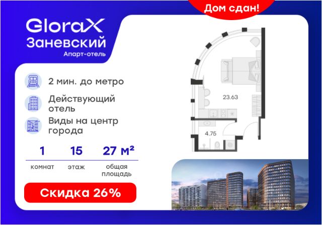 Продается 2-комн. апартамент на 10-м этаже в сданном Апарт-комплексе бизнес-класса "GloraX Заневский". Ключи сразу! Общая площадь лота составляет 43,10 кв. м, из которых 23,20 кв. м отведено под жилую. Номер апартамента - 1 008. Преимущества: - Полная чистовая отделка - Возможность покупки меблировка и техника - Вход по ключ-карте - Прачечная на 1 этаже - Возможность дозаказа отельного сервиса - Программы доходности - Летний бар и променад - Воркаут площадка - Pet-friendly Апартаменты "GloraX Заневский" - проект бизнес-класса с развитой инфраструктурой, удовлетворяющей все потребности самых взыскательных гостей. Располагается в одном из наиболее перспективных, районов Петербурга в 2х минутах от метро "Ладожская" и в 10 минутах от Невского проспекта. В "GloraX Заневский" есть все, что необходимо для комфортной жизни, работы и отдыха. Инфраструктура, покрывающая все потребности и ожидания собственников и арендаторов. В радиусе 150 метров находятся супермаркеты с возможностью доставки продуктов прямо до дверей апартаментов. На 1000 кв. м. общественных пространств расположится уютный лобби-бар, ресторан мировой кухни на 80 человек и оборудованные коворкинги. В апартаментах "GloraX Заневский" выполнена современная отделка с использованием высококачественных экологичных материалов. В проекте предусмотрен подземный отапливаемый паркинг на 100 мест, куда можно спуститься на лифте прямо от дверей апартаментов. Узнайте подробности в Отделе продаж. Продам квартиру от застройщика на проспекте Энергетиков в Санкт-Петербурге.