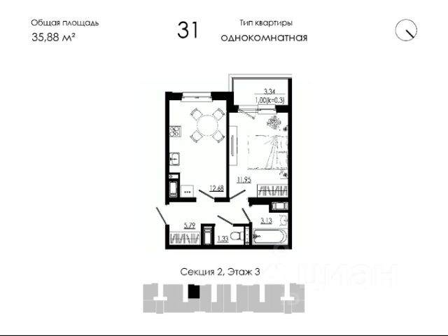 Продаётся 1-комнатная квартира в строящемся доме (Дом 19), срок сдачи: III-кв. 2026, общей площадью 35.88 кв.м., на 3 этаже. Новый жилой дом от застройщика "НК Развитие" расположен по адресу: Форносовское г.п, г.п.Форносово, ул.Круговая, уч. 19.