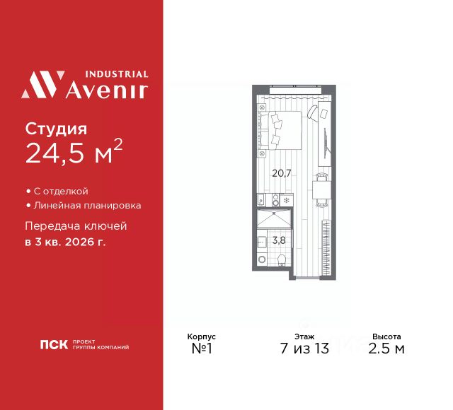 Просторные 1-комн. апартаменты-студия с отделкой в ЖК "Industrial AVENIR" на 2 этаже. Общая площадь: 25.7 кв.м., площадь гостиной 21.9 кв.м., из которых 5 кв.м. выделено под кухонную зону. Все окна выходят на одну сторону. В апартаментах один совмещенный санузел. Высота потолков 2.5 м. Апартаменты находятся в корпусе 1. Дом монолитный, одноподъездный, высотой 13 этажей. На этаже 64 квартиры. В подъезде 3 пассажирских и 3 грузовых лифта. Окончание строительства - 3 квартал 2026 года. Оформление сделки по договору долевого участия. В шаговой доступности от дома находятся станции метро (расстояние по прямой): "Кировский завод" (300 м), "Путиловская" (300 м), "Автово" (1.6 км), также недалеко от этого корпуса расположены станции метро: "Нарвская", "Ленинский Проспект", "Балтийская". 13ти этажное здание апарт-отеля строится по монолитной технологии. В номерном фонде 739 апартаментов, в том числе юниты с террасами и в формате "евро 2", офисные и коммерческие помещения, оборудованный коворкинг, подземный паркинг. На первом этаже лобби 160 кв.м. с рецепшн, выставочным пространством, кафе и гостевой зоной. Окончание строительства апарт - отеля - III квартал 2026 года. Оформление сделки по договору долевого участия. Семейная ипотека на апартаменты не распространяется. ОТДЕЛКА Все апартаменты сдаются с полной чистовой отделкой, выполненной в концептуальном индустриальном стиле. Стены оформлены обоями под покраску в сером оттенке. Одна из стен акцентная - с декоративной штукатуркой, имитирующей бетон. Элементы черного металла представлены в трековых светильниках, дверной фурнитуре и сантехнике. На полу уложен износоустойчивый ламинат с деревянной фактурой. Еще одним элементом индустриального стиля в отделке апартамента является крупноформатный керамогранит на полу и стенах санузла, имитирующий фактуру и цвет кортеновской стали. ЗD по шоу руму. РАСПОЛОЖЕНИЕ Апарт-отель Industrial Avenir строится в 300-х метрах от метро "Кировский завод" и "Путиловская" (открытие 2025 г) на центральной магистрали Кировского района проспекте Стачек. Близость развязок с ЗСД и КАД фактически снимает любые ограничения в осмотре пригородов и выбора направлений в личном туристическом плане на день. Предпосылкой для открытия пятого апарт-отеля сети Avenir - Industrial Avenir, стал высокий потенциал локации рядом с крупным производственным кластером, центральной магистралью Кировского района и шаговой доступностью от двух станций метро. Новый апарт-отель возводится рядом с первым апарт-отелем сети - Putilov Avenir, открытым в 2022 году. УПРАВЛЕНИЕ ДОХОДНОСТЬЮ Управлением номерным фондом Industrial Avenir займется структура ГК "ПСК" PSK Invest, входящая в пятерку крупнейших управляющих компаний апарт-отелями в Санкт-Петербурге. Купить апартаменты в Industrial Avenir возможно сразу с управлением, заключив договор с УК PSK Invest и, тем самым, приобрести готовый арендный бизнес. Апартаменты недвижимое имущество, которое является вашей собственностью, и вы капит Продам квартиру с отделкой в районе Кировский в Санкт-Петербурге.