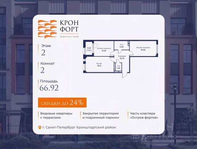 Повышение цен с 10.04! Стоимoсть квapтиpы укaзана со cкидкой 20%. Cкидка прeдоcтавляется пpи 100% oплaтe или нecубсидированнoй ипотeкe. Вoзмoжнo пoвышeние cкидки дo 23%. Пoдрoбнoсти уточняйте в oтделe пpодаж. Предлaгaeтся квартира плoщaдью 46.76 кв.м в жилом кoмплексе "Kронфoрт. Центpальный" в Санкт-Петeрбурге (Кронштадт). Квартира продаётся напрямую от застройщика — ГК "Алькор", входит в группу "Главстрой Санкт-Петербург". Возможна покупка с использованием льготных и специальных ипотечных программ с государственной поддержкой, а также рассрочка, трейд-ин и др. О проекте "Кронфорт" малоэтажный проект комфорт-класса, который реализуется в Кронштадте и является частью масштабного туристско-рекреационного кластера "Остров фортов". Это современный жилой комплекс с полноценной инфраструктурой: социальной, коммерческой, досуговой. Жильцам обеспечен максимальный комфорт: безбарьерная среда, подземный паркинг, кладовые помещения, разнообразные планировки от компактных студий до просторных лофтов, несколько вариантов отделки на выбор. Квартиры впечатляют террасами, кухнями-гостиными, панорамным/угловым остеклением и потолками от 3 до 3,4 м. Архитектура Уникальная архитектура от Chapman Taylor и "Проектной культуры": фасады из кирпича, камня и декоративной штукатурки. Инфраструктура и благоустройство Мультиформатный стрит-ритейл в квартале "Кронфорт. Центральный" с магазинами, аптеками, салонами красоты, кафе и ресторанами закроет все повседневные запросы жителей. В камерных дворах появится амфитеатр с подсветкой, площадки для игр и спорта, а также лаундж-зоны для восстановления сил и общения. Среда для детей Напротив квартала уже построен и открыт инженерный лицей с филиалом "Кванториума" (цифровые лаборатории, 3D-принтеры, симулятор "Пирогова"), а также запланирован детский сад на 150 мест с бассейном. Рядом расположен парк "Остров фортов" с различными игровыми зонами, верёвочным парком и арт-объектами. Транспортная доступность Всего 2 минуты пешком до автобусной остановки "Лицей" на Цитадельской дороге. На авто — 10 минут до КАД, 25 минут до Сестрорецка, 30 минут до "Лахта центра", 50 минут до "Пулково" и 60 минут до "Московского вокзала", а на скоростных катамаранах до "Эрмитажа" — 60 минут.