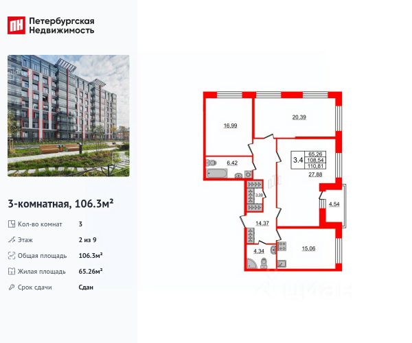 Квартира с двумя спальнями в комплексе "Сампсониевский 32" от LEGENDA на 3 этаже.