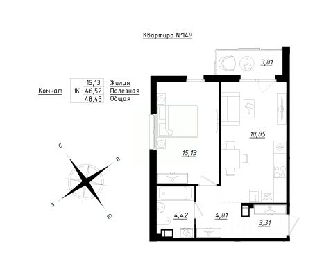 Предлагается к продаже Евро 2х комнатная квартира 44,57 кв. м с просторной кухней-гостиной 23,08 кв.м.