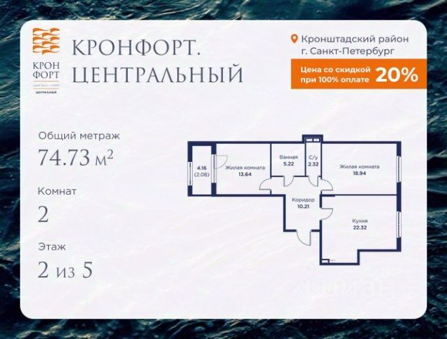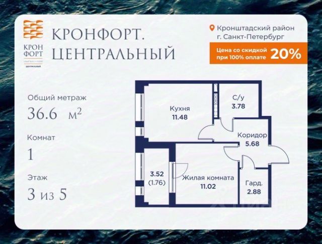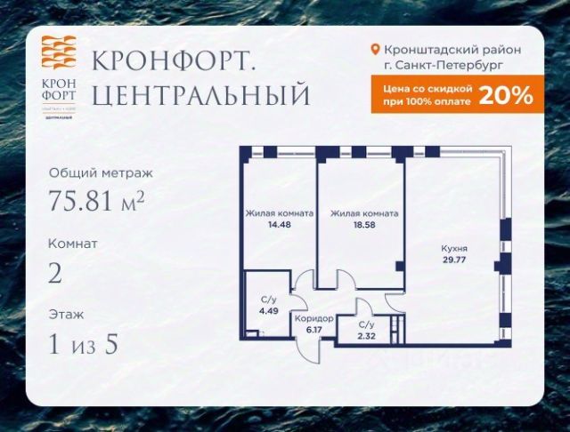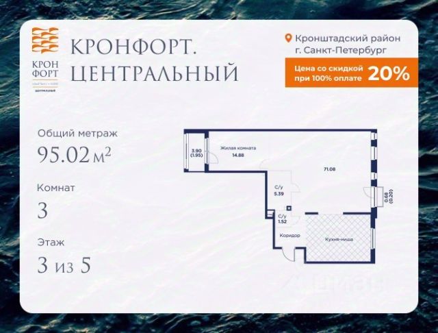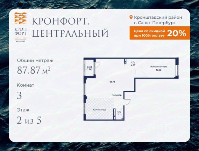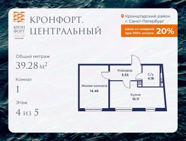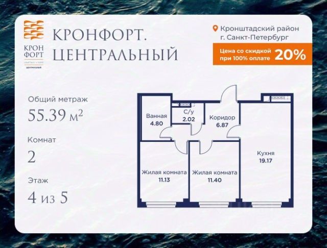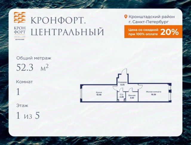 Стоимость квартиры указана со скидкой 20%. Скидка предоставляется при 100% оплате или несубсидированной ипотеке. Предлагается квартира площадью 46.76 кв.м в жилом комплексе "Кронфорт. Центральный" в Санкт-Петербурге (Кронштадт). Возможна покупка с использованием льготных и специальных ипотечных программ с государственной поддержкой. Высота потолков в квартирах — от 3 до 3,4 метров, окна увеличенного размера, есть варианты с эркерами, французскими балконами, лоджиями и террасами. Жилой квартал состоит из пяти четырехэтажных корпусов с закрытыми охраняемыми дворами, свободными от машин. Первые этажи формируют торговые променады в стиле пешеходных улиц исторической части Петербурга и Кронштадта. Внутренние пространства между корпусами — пешеходные зоны с уютными площадями. Архитектурный облик квартала разработан бюро "Проектная культура" и международной компанией Chapman Taylor. Инфраструктура комплекса включает: - Лицей с двумя бассейнами - Детский сад на 150 мест с бассейном и закрытой территорией - Веревочный парк - Игровые площадки для активного отдыха; - Кабинет врача общей практики. - Подземные паркинги с лифтами. - Мусоросборные камеры, индивидуальные кладовые. - Закрытые дворы с контролем доступа и видеонаблюдением. - Мультформатный стрит-ретейл с кафе и ресторанами. - Триатлон-центр и беговые/велодорожки. - Учебно-тренировочный комплекс для детей "Лагерь настоящих героев". Транспортная доступность обеспечивает удобный выезд на КАД (около 1-3 км), 2 минуты пешком до автобусной остановки "Лицей", 25 минут до Сестрорецка, 30 минут до "Лахта-центра", 50 минут до аэропорта "Пулково" и 60 минут до Московского вокзала. Для любителей моря доступен маршрут на "Метеоре" до центра Санкт-Петербурга. Отделка квартир предлагается как с готовой чистовой отделкой, так и со свободной планировкой без отделки для реализации индивидуальных дизайнерских решений. В третьем корпусе, продажи которого стартовали в марте 2025 года, доступны квартиры с просторными террасами, тремя балконами, кухнями-гостиными до 38 кв.м с окнами на две стороны, обеспечивающими панорамное освещение и виды. Если вам нужна помощь с оформлением ипотеки или дополнительная информация по комплексу и условиям покупки, обращайтесь в отдел продаж за консультацией. Продам квартиру первичка в Кронштадте.