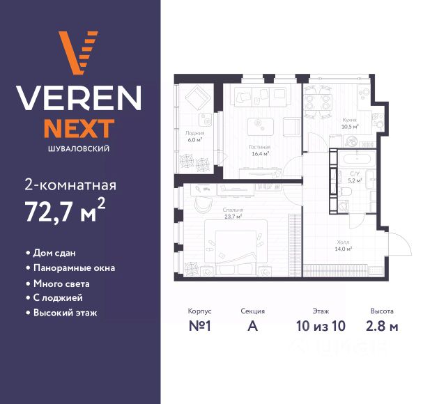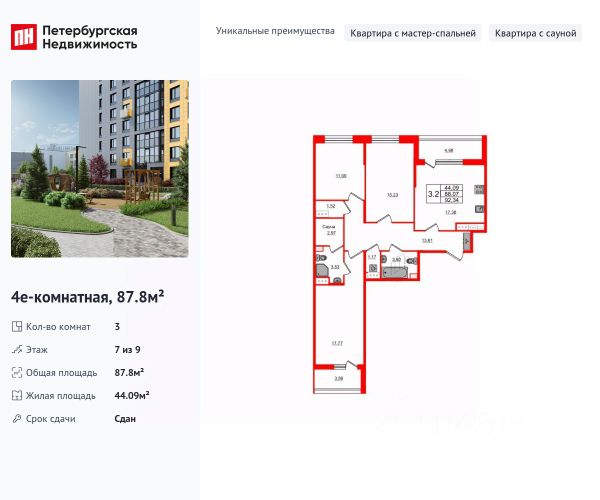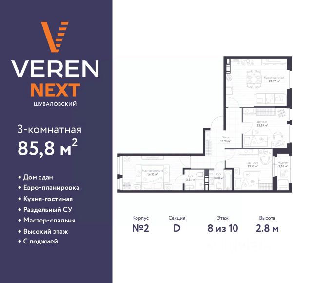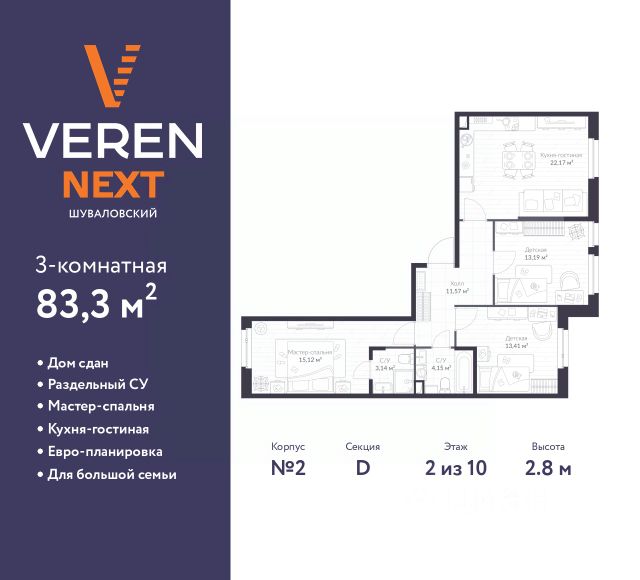 Продается 3-комн. квартира от застройщика в ЖК "VEREN NEXT Шуваловский" на 7 этаже. Квартира без отделки, полностью готова к ремонту. Общая площадь: 88.1 кв.м., жилая: 42.88 кв.м., площадь просторной куxни-гостиной: 24.15 кв.м. Квартира - распашонка, без проходных комнат, окна выходят на paзные стороны дома. В квартире одна лоджия, два совмещенных санузла. Высота потолков 2.8 м.