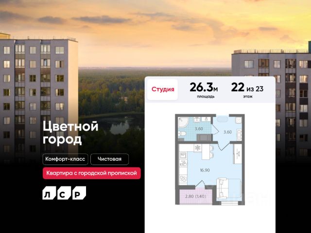 Продается студия в ЖК "Цветной город" на 16 этаже. Общая площадь составляет 26.50 кв. м. Квартира с чистовой отделкой Срок сдачи дома: 1 квартал 2025. Жилой комплекс "Цветной город" располагается по адресу Санкт-Петербург, Красногвардейский. "Цветной город" - современный масштабный эко-проект: жилые кварталы со своей сетью улиц, пешеходными бульварами и велодорожками, площадками для спорта и отдыха. Кварталы располагаются вдоль береговой линии реки Охты. "Цветной город" - это жизнь вблизи природы, но с городской пропиской. К 2026 году на берегах реки Охты будет создан Пейзажный парк с летними экотропами и зимними горками для тюбингов, скейт-парком и летним кинотеатром. В ЖК "Цветной город" запланировано и уже частично реализовано строительство 10 школ, 16 детских садов, 4 поликлиники, больница, ТРК, спортивно-оздоровительные сервисы С центром Петербурга жителей "Цветного города" свяжет Пискарёвский проспект, удобный выезд на КАД позволяет без труда добираться до других районов. Расположение: • 10 минут на авто до КАД; • 15 минут на авто до станций "Гражданский проспект" и "Академическая"; • 20 минут до ж/д станции "Ручьи".; Квартира сдается с готовой отделкой из современных экологичных материалов: на стенах плотные белые обои под покраску, на полу износостойкий матовый ламинат, в санузлах керамическая плитка на стенах и керамогранит на полу. Трубы отопления скрыты в стяжке пола и не мешают мебели. В квартире предусмотрено большое количество двойных розеток и выключателей. В ЖК "Цветной город" предусмотрена система "Умный дом": смартфон с приложением является ключом от всех дверей в ЖК, гостевой доступ оформляется в приложении, видеозвонки от домофона поступают в приложение, показания счетчиков автоматически передаются в учетные базы ЖКХ. Преимущества: • Рядом лесопарк и река Охта • Живописные виды из окон • Безбарьерная среда • Развитая социальная инфраструктура • Система "Умный дом" Успейте приобрести квартиру на выгодных условиях! Чтобы узнать подробности, обращайтесь за консультацией по телефону. Купить квартиру первичка на улице Чарушинская в Санкт-Петербурге.