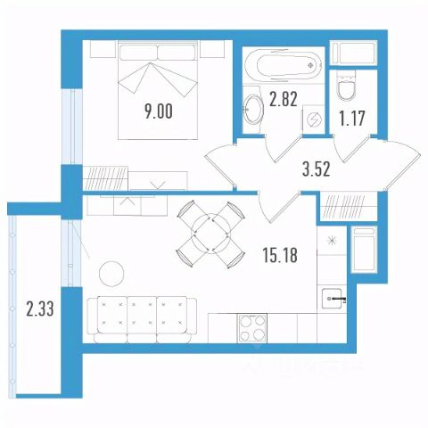 кухня - гостиная 23.63м2 , спальня 12.39м2, с/у 4.82м2, гардеробная 3.76м2 и коридор 5.08, лоджия 3.51м2