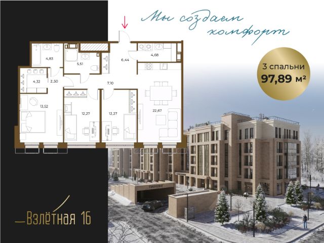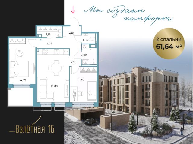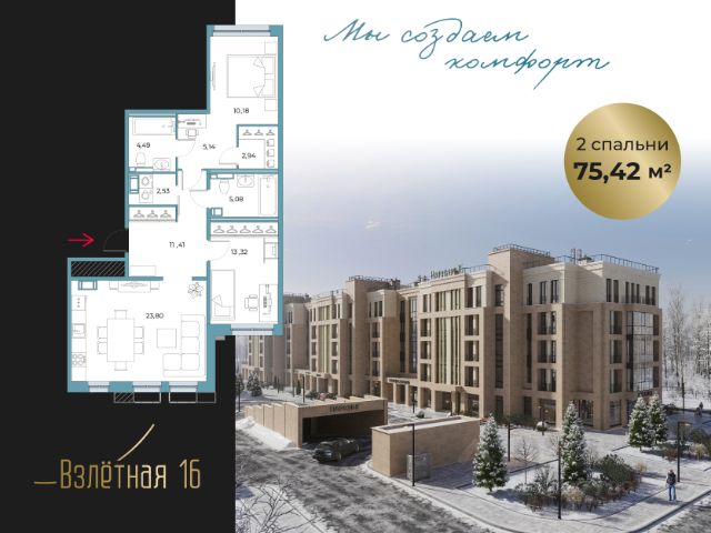 Продается квартира с 2 спальнями в жилом комплексе бизнес-класса "Взлетная 16". Общая площадь квартиры составляет 62.6 м2 из которых 22,87 м2 отведено под просторную кухню-гостиную с двумя окнами и дополнительным окном в рабочей зоне кухни, а также выходм на террасу. Спальня 13,80 с гардеробной. Новый ЖК "Взлетная 16", камерный малоэтажный дом на 68 квартир. Дом состоит из трех 5-этажных секций. Комплекс является уникальным за счет небольшого количества квартир с большим выбором продуманных планировочных решений. Важной особенностью жилого комплекса является наличие подземного паркинга на 42 парковочных места + гостевая парковка, закрытый и безопасный внутренний двор, колясочные и велосипедные в парадных, 30 кладовых помещения в подземном паркинге, как дополнительное место хранения сезонных вещей. На первом этаже комплекса расположены коммерческие помещения, где разместится инфраструктура для жителей дома фитнес-студия, коворкинг, салон красоты, пекарня, магазин и пункт выдачи интернет-заказов. Также на территории комплекса расположится детское дошкольное учреждение с площадкой для игр. Вся территория комплекса, включая паркинг и прилегающие зоны, оснащена камерами видеонаблюдения. Территория двора зонирована для максимального комфорта, предусмотрены современная детская площадка, пространства для рекреации и уединения. Ландшафтный дизайн в проекте ЖК "Взлетная 16" вдохновлен стилем французского парка, растения подобраны по принципу непрерывно цветущего сада, который не требователен в уходе и адаптирован под условия северной природы. ЖК "Взлетная 16" - идеальное пространство для спокойной семейной жизни в созвучии с динамикой городского комфорта. Строгость линий, многоплановость фасадов, внимание к деталям — вот что лежит в основе подхода к архитектурным решениям, объединяющим привычную классику и актуальность.