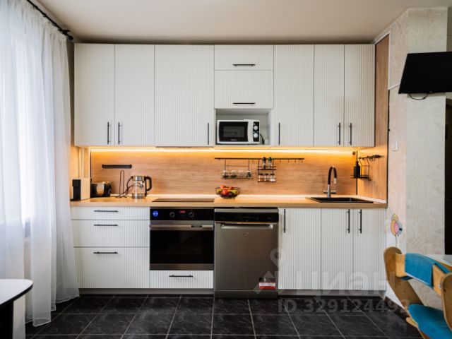 Кухня - большая, функциональная, со встроенной техникой. Много зон освещения - под любой сценарий: готовка, ужин, фильм. На полу - практичный кварц-винил.