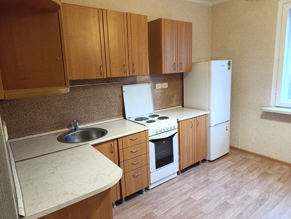 Просторная Кухня 13.5м2 с современным новым кухонным гарнитуром (из техники: встроенные варочная панель, духовой шкаф,СВЧ печь,вытяжка). Вся мебель и техника остаются.
