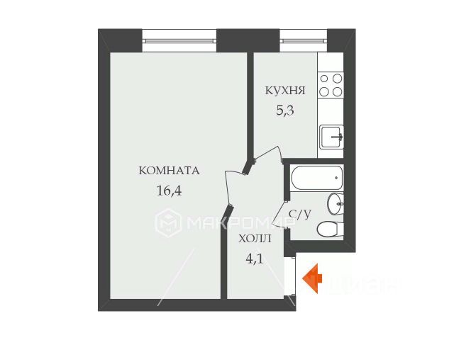 Комната - 16.4 кв.м с просторным гардеробным шкафом.