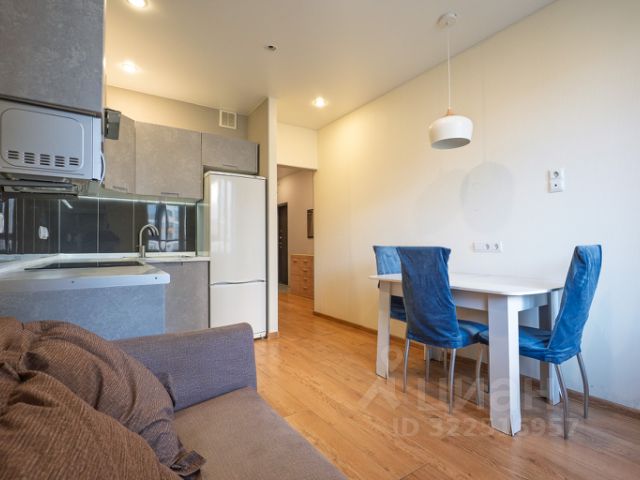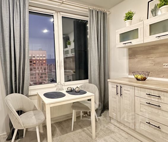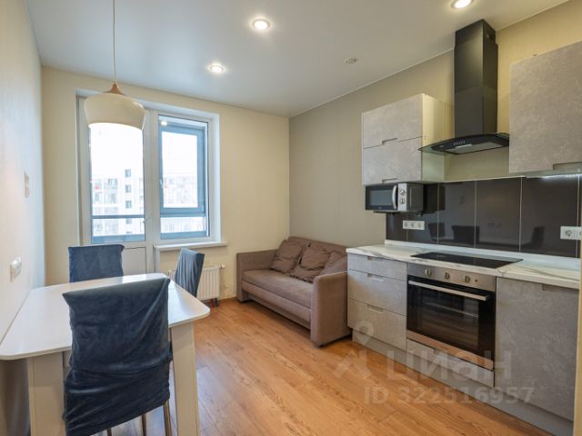Кухня-гостиная площадью 17,7 м2 с кухонным островком. На островке удобно готовить и завтракать или устроить кулинарный поединок с членами семьи или гостями. Кухонная зона оборудована всей необходимой техникой, в том числе вместительной посудомоечной машиной 60 см шириной, плитой, духовкой, холодильником и фильтром питьевой воды. Также здесь раскладной двухспальный диван - для размещения гостей. Из кухни-гостиной имеется выход на балкон 4,4 м2 с панорамным остеклением, где приятно провести время.