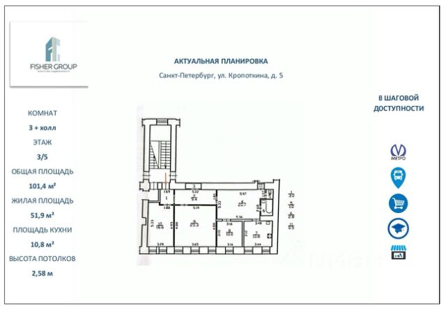 Вашему вниманию предлагаем просторную, светлую и уютную квартиру в самом центре Петроградки. О районе Петроградской район считается одним из старейших районов города, так как именно здесь, на Заячьем острове, была основана Петропавловская крепость — начало Санкт-Петербурга. Район сочетает в себе тихие улочки, старинные особняки, современные кафе и гастрономические кластеры, что создаёт особую интеллигентную и неспешную атмосферу. О доме Год постройки 1910, по индивидуальному проекту. Стены выполнены из кирпича, перекрытия железобетонные. Дом расположен на тихой улице. Жители Петроградской района могут получить льготное парковочное разрешение, парковка расположена напротив дома. Три станции метро в шаговой доступности: до Горьковской 8 минут, до Петроградской 11 минут, до Чкаловской 15 минут пешком. Также в шаговой доступности детские сады, школы, в том числе с углубленным изучением иностранных языков. О квартире Общая площадь квартиры 101,4 кв. м., которая включает в себя: Три жилые комнаты (10,0+25,3+16,6); Холл 20,7; Кухня 10,8; Раздельный санузел. Высота потолков 2,58, сделано комбинированное решение по точечным и навесным светильникам. В квартире выполнен качественный ремонт. За счёт большого количества окон в квартире светло и просторно. О документах Один взрослый собственник с 2014 года. Полностью узаконенная перепланировка. Документы полностью готовы к сделке. Подходят все варианты оплаты. Лёгкий встречный вариант. Звоните и записывайтесь на просмотры, будем рады показать квартиру в удобное для вас время! Номер объекта: #1/537146/24744