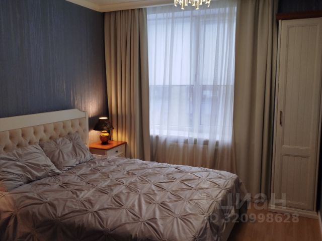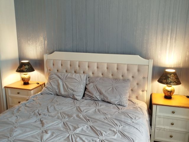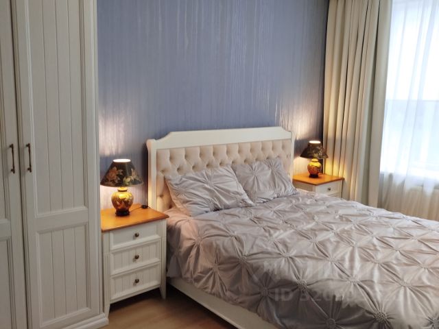 • Спальня - крашенные двери с магнитным замком, двухспальная кровать, установлен кондиционер, подсветка штор, бра над кроватью, люстра и световые точки, рабочая зона со столом, небольшой банкеткой и зеркалом с подсветкой, удобные розетки и выключатели над подвесными тумбами у кровати , дубовые подоконник и порог балкона под лаком, подвесная тв тумба с местом для хранения, стильный радиатор
