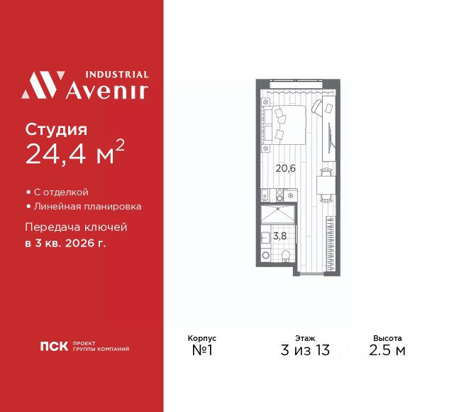 1-комн. апартаменты-студия с отделкой в ЖК "Industrial AVENIR" на 3 этаже. Общая площадь: 20.6 кв.м., площадь гостиной 16.8 кв.м., из которых 5 кв.м. выделено под кухонную зону. Все окна выходят на одну сторону. В апартаментах один совмещенный санузел. Высота потолков 2.5 м. Апартаменты находятся в корпусе 1. Дом монолитный, одноподъездный, высотой 13 этажей. На этаже 64 квартиры. В подъезде 3 пассажирских и 3 грузовых лифта. Окончание строительства - 3 квартал 2026 года. Оформление сделки по договору долевого участия. В шаговой доступности от дома находятся станции метро (расстояние по прямой): "Кировский завод" (300 м), "Автово" (1.6 км), также недалеко от этого корпуса находятся станции метро: "Нарвская", "Ленинский Проспект", "Балтийская". 13ти этажное здание апарт-отеля строится по монолитной технологии. В номерном фонде 739 апартаментов, в том числе юниты с террасами и в формате "евро 2", офисные и коммерческие помещения, оборудованный коворкинг, подземный паркинг. На первом этаже лобби 160 кв.м. с рецепшн, выставочным пространством, кафе и гостевой зоной. Окончание строительства апарт - отеля - III квартал 2026 года. Оформление сделки по договору долевого участия. Семейная ипотека на апартаменты не распространяется. ОТДЕЛКА Все апартаменты сдаются с полной чистовой отделкой, выполненной в концептуальном индустриальном стиле. Стены оформлены обоями под покраску в сером оттенке. Одна из стен акцентная - с декоративной штукатуркой, имитирующей бетон. Элементы черного металла представлены в трековых светильниках, дверной фурнитуре и сантехнике. На полу уложен износоустойчивый ламинат с деревянной фактурой. Еще одним элементом индустриального стиля в отделке апартамента является крупноформатный керамогранит на полу и стенах санузла, имитирующий фактуру и цвет кортеновской стали. ЗD по шоу руму. РАСПОЛОЖЕНИЕ Апарт-отель Industrial Avenir строится в 300-х метрах от метро "Кировский завод" и "Путиловская" (открытие 2025 г) на центральной магистрали Кировского района проспекте Стачек. Близость развязок с ЗСД и КАД фактически снимает любые ограничения в осмотре пригородов и выбора направлений в личном туристическом плане на день. Предпосылкой для открытия пятого апарт-отеля сети Avenir - Industrial Avenir, стал высокий потенциал локации рядом с крупным производственным кластером, центральной магистралью Кировского района и шаговой доступностью от двух станций метро. Новый апарт-отель возводится рядом с первым апарт-отелем сети - Putilov Avenir, открытым в 2022 году. УПРАВЛЕНИЕ ДОХОДНОСТЬЮ Управлением номерным фондом Industrial Avenir займется структура ГК "ПСК" PSK Invest, входящая в пятерку крупнейших управляющих компаний апарт-отелями в Санкт-Петербурге. Купить апартаменты в Industrial Avenir возможно сразу с управлением, заключив договор с УК PSK Invest и, тем самым, приобрести готовый арендный бизнес. Апартаменты недвижимое имущество, которое является вашей собственностью, и вы капитализируете свои вложения и получаете