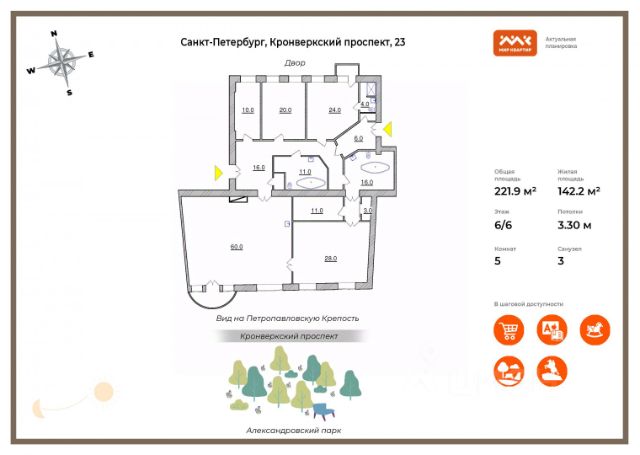 Арт. 111853184 Тишина исторического центра и величие сталинской архитектуры — эта квартира воплощает лучшие традиции петербургского неоклассицизма с современным комфортом. В планировке три изолированные большие спальни для максимального комфорта и приватности каждого члена семьи, большая гостиная 32 м.кв , два полноценных санузла. Просторная Мастер-спальня с эркером и большой ванной комнатой с окном — идеальное место для отдыха и уединения. Высота потолков 3.3 м. Есть отдельная гардеробная комната. Пол во всей квартире выполнен в один уровень — это особенно удобно для маленьких детей и пожилых людей. Каждая деталь интерьера подчёркивает статус и качество: -Входные двери повышенной прочности с итальянскими замками, -дубовые окна с немецкой фурнитурой, -межкомнатные двери из натурального дуба высотой 2.3 м, -широкие метровые подоконники из натурального мрамора, -декоративные розетки на потолке из натурального гипса выполнены по индивидуальным эскизам вручную, в спальне и столовой — галтели из натурального гипса. Квартира находится в доме с железобетонными перекрытиями. В парадной выполнен косметический ремонт, коммунальных квартир нет. Закрытый двор этого дома — самый большой зелёный двор на Большом проспекте. Въезд с пульта, работает видеонаблюдение перед входной дверью и парковочной зоной. Престижная локация в парадном центре Петроградского района. Всего 200 метров от Каменноостровского проспекта, 5 минут пешком до станции метро "Петроградская",1 минута до Матвеевского сада, до Петропавловской крепости — 15 минут пешком. Рядом есть всё необходимое для комфортной жизни: кафе, рестораны и магазины, гимназии, фитнес-центры, театры, музеи и многое другое. Звоните, чтобы узнать детали и договориться о просмотре! прямая продажа, обременений нет.