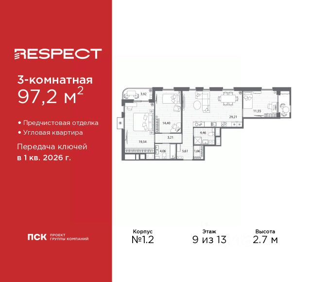 3-комн. квартира с предчистовой отделкой в ЖК "RESPECT" на 9 этаже. Общая площадь: 79.72 кв.м., жилая: 44.24 кв.м., площадь просторной кухни-столовой: 16.03 кв.м. Квартира угловая, идеально подойдет любителям тишины и панорамных видов. В квартире один балкон и две лоджии, один совмещенный и один раздельный санузел. Высота потолков 2.7 м. Квартира будет сдана с отделкой WHITE BOX, в которую включены следующие виды работ: - заливка стяжки; - установлена система отопления квартиры; - подготовлены потолки; - все стены выровнены, загрунтованы и отштукатурены; - электрическая проводка разведена по комнатам. Квартира будет готова к чистовой отделке. Квартира находится в корпусе 6. Дом монолитный, одноподъездный, высотой 13 этажей. На этаже 8 квартир. В подъезде 1 пассажирский и 1 грузовой лифт. Окончание строительства - 4 квартал 2026 года. Оформление сделки по договору долевого участия. В шаговой доступности от жилого комплекса расположены станции метро (расстояние по прямой): "Лесная" (800 м), "Площадь Мужества" (1.4 км), "Выборгская" (1.9 км), также недалеко от этого корпуса расположены станции метро: "Академическая", "Политехническая". Жилой квартал "RESPECT" строится на Полюстровском пр, 87, в одной из самых востребованных локаций Петербурга. В 10 минутах пешком - метро "Лесная" и в 10 минутах на транспорте - Петроградская сторона. Высота домов от 7 до 13 этажей. Квартиры сдаются с отделкой white box и с чистовой отделкой. На территории Respect строится школа на 1125 учащихся и детский сад на 240 мест. Запроектированы собственная газовая котельная, закрытая территория, дворы без машин и подземные паркинги с лифтами. В проекте предусмотрены трапециевидные балконы или остекленные лоджии, которые, с одной стороны, исключают монотонность фасада, являясь декоративными элементами, с другой дополнительным функциональным пространством в квартирах. Цветовая гармония фасадов каждого дома раскрывает характер квартала. Коричневый цвет клинкерного кирпича со структурой водяных штрихов — цвет уюта и безопасности, сдержанности и надёжности. Вентилируемые фасады облицованы клинкерным кирпичом. Его высокая прочность позволяет давать 100 лет гарантии на этот материал. Водопоглощение клинкерного кирпича составляет менее 5%, за счет чего у него высокая теплопроводность и прочность. В квартале запроектированы внутренние закрытые территории дворов домов без доступа автомобилей и безбарьерная среда для велосипедистов и колясок. Предусмотрены IP-домофония с функцией дистанционного открывания калиток и парадных, а также дистанционный сбор показаний счетчиков и мобильное приложение для жителей. Для безопасности жителей квартала - круглосуточное видеонаблюдение и служба охраны. В каждой квартире предусмотрены внешние корзины для кондиционеров. Вся территория квартала будет связана единой концепцией благоустройства, разработанной ландшафтным бюро L.BURO. На эксплуатируемой кровле на уровне первого этажа в домах 1 и 4 будут обустроены общественные видовы