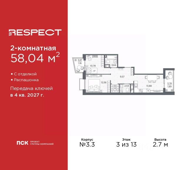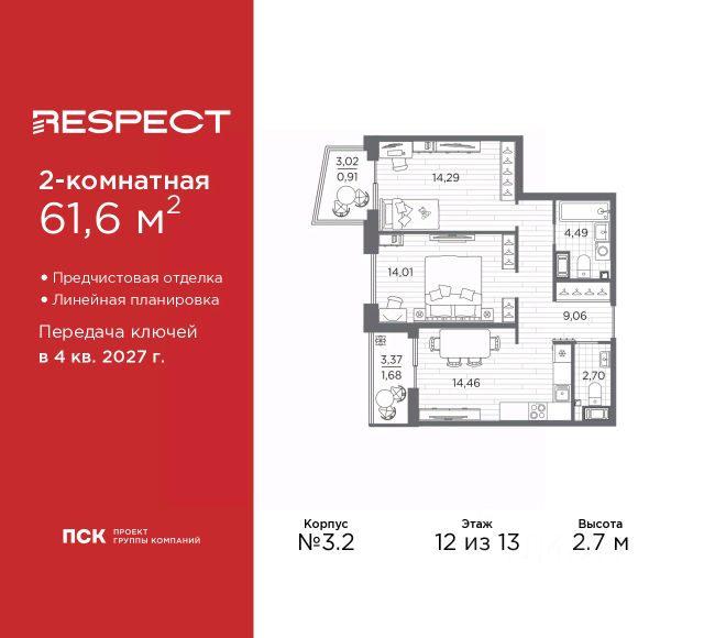 3-комн. квартира с предчистовой отделкой в ЖК "RESPECT" на 5 этаже. Общая площадь: 76.55 кв.м., жилая: 34.01 кв.м., площадь просторной кухни-столовой: 18.59 кв.м. Комнаты изолированные, все окна выходят на одну сторону. В квартире одна лоджия, два совмещенных санузла. Высота потолков 2.7 м. Квартира находится в корпусе 1. Дом монолитный, одноподъездный, высотой 13 этажей. На этаже 6 квартир. В подъезде 1 пассажирский и 1 грузовой лифт. Окончание строительства - 1 квартал 2026 года. Оформление сделки по договору долевого участия. В шаговой доступности от жилого комплекса расположены станции метро (расстояние по прямой): "Лесная" (800 м), "Площадь Мужества" (1.4 км), "Выборгская" (1.9 км), также недалеко от этого корпуса находятся станции метро: "Академическая", "Политехническая". Жилой квартал "RESPECT" строится на Полюстровском пр, 87, в одной из самых востребованных локаций Петербурга. В 10 минутах пешком - метро "Лесная" и в 10 минутах на транспорте - Петроградская сторона. Высота домов от 7 до 13 этажей. Квартиры сдаются с отделкой white box и с чистовой отделкой. На территории Respect строится школа на 1125 учащихся и детский сад на 240 мест. Запроектированы собственная газовая котельная, закрытая территория, дворы без машин и подземные паркинги с лифтами. В проекте предусмотрены трапециевидные балконы или остекленные лоджии, которые, с одной стороны, исключают монотонность фасада, являясь декоративными элементами, с другой дополнительным функциональным пространством в квартирах. Цветовая гармония фасадов каждого дома раскрывает характер квартала. Коричневый цвет клинкерного кирпича со структурой водяных штрихов — цвет уюта и безопасности, сдержанности и надёжности. Вентилируемые фасады облицованы клинкерным кирпичом. Его высокая прочность позволяет давать 100 лет гарантии на этот материал. Водопоглощение клинкерного кирпича составляет менее 5%, за счет чего у него высокая теплопроводность и прочность. В квартале запроектированы внутренние закрытые территории дворов домов без доступа автомобилей и безбарьерная среда для велосипедистов и колясок. Предусмотрены IP-домофония с функцией дистанционного открывания калиток и парадных, а также дистанционный сбор показаний счетчиков и мобильное приложение для жителей. Для безопасности жителей квартала - круглосуточное видеонаблюдение и служба охраны. В каждой квартире предусмотрены внешние корзины для кондиционеров. Вся территория квартала будет связана единой концепцией благоустройства, разработанной ландшафтным бюро L.BURO. На эксплуатируемой кровле на уровне первого этажа в домах 1 и 4 будут обустроены общественные видовые террасы. Это станет не только привлекательным местом с красивым видом, но и удобным, многофункциональным пространством. Дизайн парадных зон и входных групп - сочетание лаконичности отделки и декоративных элементов с текстурами из натурального камня и дерева с приглушенной подсветкой теплым светом. Во входных группах расположены гостевые зоны с мягкой мебел