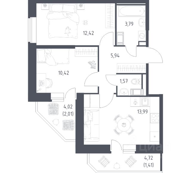 В продаже 2-комнатная квартира в корпусе 96 ЖК 'Живи! В Рыбацком'. Квартира располагается на 3 этаже, общая площадь 59.04 м2.