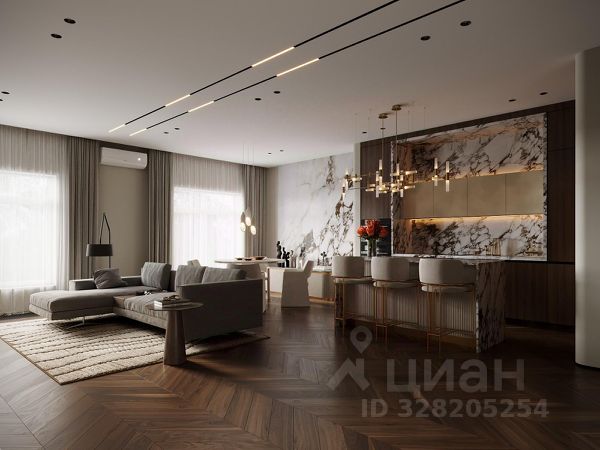 - просторная кухня-гостиная с ТВ-зоной, с шикарной оборудованной кухней с островом, обеденной зоной у окна с видом на воду. Премиальные материалы и интерьерные решения.
