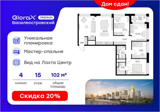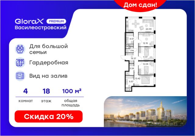Продается 2-комн. квартира на 3-м этаже в сданном проекте премиум-класса GloraX Premium Василеостровский. Общая площадь лота составляет 65,69 кв. м, из которых 33,77 кв. м отведено под жилую и 13,53 кв. м под кухонную зону. Номер квартиры - 628 Преимущества квартиры: • Просторная кухня-гостиная — светлое и функциональное пространство, где легко развернуться и в приготовлении ужина, и в дружеской компании. Это сердце дома, созданное для тепла, общения и настоящего уюта. • Вид во двор — тихая, зелёная перспектива за окном дарит спокойствие и уединение, защищая от городской суеты и шума. • Два санузла — продуманная планировка обеспечивает комфорт и удобство для всех членов семьи или гостей, избавляя от утренних очередей и создавая ощущение личного пространства для каждого. • Эта квартира — идеальный баланс между практичностью, комфортом и атмосферой домашнего тепла. GloraX Premium Василеостровский это роскошный видовой комплекс премиум-класса на первой береговой линии Финского залива. Проект уникален по своему опциональному наполнению: вся необходимая для комфортной городской жизни инфраструктура будет в составе самого комплекса. Здесь откроется фитнес-клуб класса премиум, кинотеатр только для резидентов, летом будет работать общая видовая терраса на крыше, откуда откроются потрясающие виды на воду. В GloraX Premium Василеостровский расположится гастрономический кластер - ресторанная улица с видом на Финский залив. В пяти минутах пешком от проекта GloraX строит образовательный кластер. В состав кластера войдет общеобразовательная школа с развивающими пространствами, футбольным полем, большим спортивным стадионом и 2 -мя плавательными бассейнами. Во втором корпусе проекта откроется детский сад с собственной территорией для прогулок. Транспортную доступность обеспечивает близость к ЗСД. Дорога до Дворцовой площади займет 25 минут на автомобиле. Ближайшая остановка общественного транспорта находится в 1 минуте пешком от комплекса. Все квартиры передаются с отделкой White Box. Цена указана при 100% оплате или стандартной ипотеке. Узнайте подробности в Отделе про
