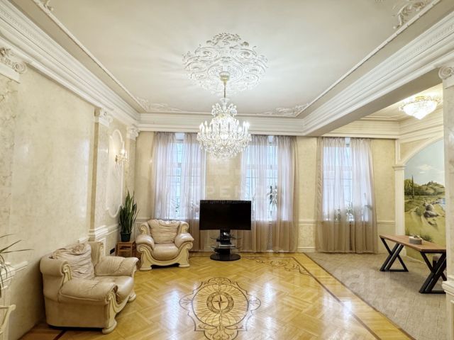 Уникальное предложение квартиры по местоположению, дому, отделке и интерьеру. Квартира 259,2 кв.м., пятикомнатная, большая кухня-столовая, три санузла, кладовые, два входа с разных парадных. Готовая к проживанию, не требуется косметический ремонт. Квартира в таком исключительном месте и неповторимом виде будет семейной ценностью и реликвией, соответствует духу Санкт-Петербурга. Находится в самом центре исторических и культурных мест города, расположение дома на набережной реки Мойки усиливает ее ценность. Квартира видовая, из всех окон открывается замечательный вид на реку Мойку и набережную, на памятник Николаю I и площадь Исаакиевского собора, легендарный отель Астория, Синий и Красный мосты. В минутах ходьбы Исаакиевский собор, Медный всадник, отель Англетер, Законодательное собрание Санкт-Петербурга, Зимний Дворец, Казанский собор, Спас на Крови, Государственный Эрмитаж, Новая Голландия, академические театры Санкт-Петербурга. Квартира располагается в бывшем доходном доме Корпуса К. Б., построенном по проекту известного архитектора Гешвенда А.Р. Класс проекта - элитный дом, архитектура - эклектика. Собственником квартиры проведен капитальный ремонт, редкий случай, когда новые бетонные перекрытия сделаны между соседними верхними и нижними этажами, заменены все инженерные коммуникации, произведена шумо-изоляция помещений. Городом проведен капитальный ремонт всего дома. Отделка и интерьер выполнены собственником квартиры в историческом санкт-петербургском дворцовом стиле, профессионально и качественно, каждая деталь продумана до мелочей. Роспись потолков, стен и проемов создавалась художниками Академии художеств им. И. Репина и Российской Академию Живописи, Ваяния и Зодчества Ильи Глазунова. Дубовый паркет, двери, оконные рамы и элементы интерьера изготовлены на заказ в санкт-петербургских мастерских. Отдельные элементы стен, проемов, эркеров и подоконники отделаны натуральным камнем оникс. Восстановленный действующий камин с аутентичными изразцами. Квартира обустроена предметами интерьера, соответствующие элементам отделки.