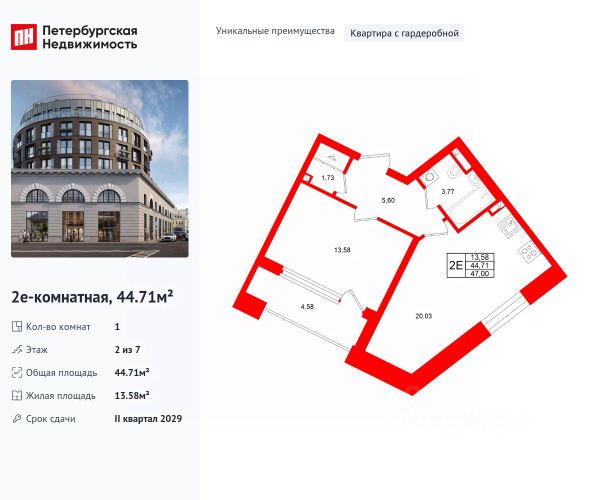 Комната площадью 17 кв. м с отдельной гардеробной, кухня 13 кв. м. Квартира правильной и функциональной планировки с панорамным окном на кухне. Светлая и очень уютная.