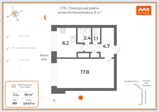 Крайне удачное местоположение, до метро "Пионерская" 15 минут пешком и "Комендантский проспект" 20 минут пешком.